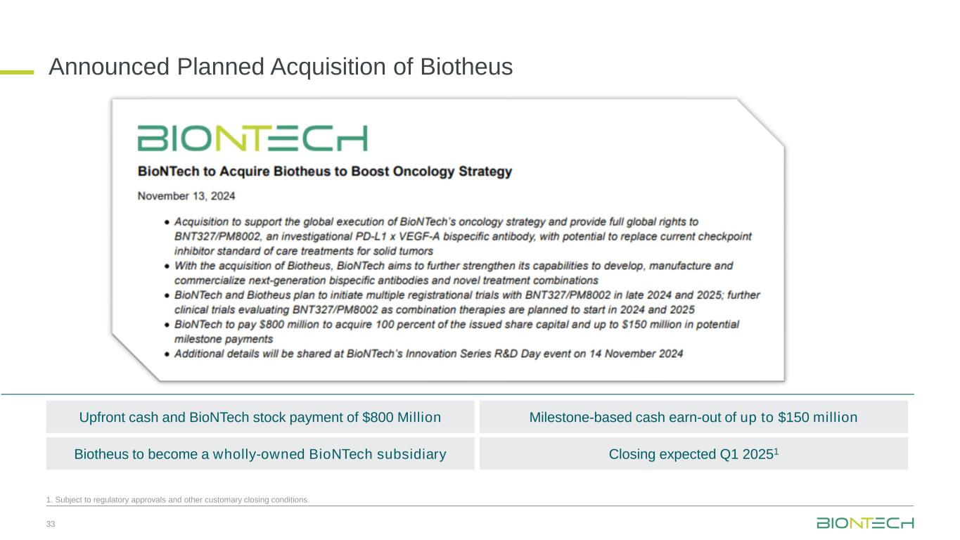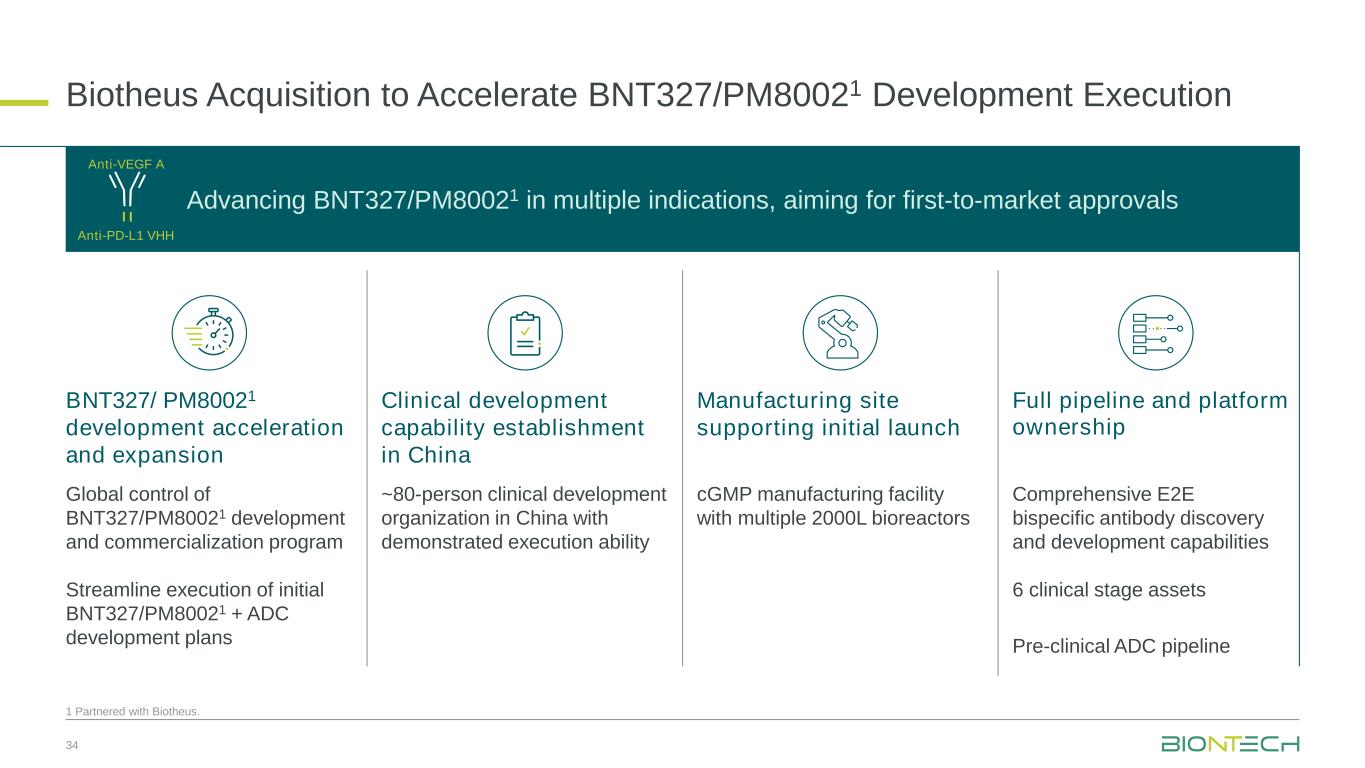 Announced Planned Acquisition of Biotheus 1. Subject to regulatory approvals and other customary closing conditions. Upfront cash and BioNTech stock payment of $800 Million Biotheus to become a wholly-owned BioNTech subsidiary Milestone-based cash earn-out of up to $150 million Closing expected Q1 20251 33