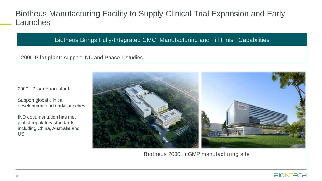 Advancing BNT327/PM80021 in multiple indications, aiming for first-to-market approvals Biotheus Acquisition to Accelerate BNT327/PM80021 Development Execution 34 1 Partnered with Biotheus. Anti-VEGF A Anti-PD-L1 VHH BNT327/ PM80021 development acceleration and expansion Clinical development capability establishment in China Full pipeline and platform ownership Manufacturing site supporting initial launch cGMP manufacturing facility with multiple 2000L bioreactors Comprehensive E2E bispecific antibody discovery and development capabilities 6 clinical stage assets Pre-clinical ADC pipeline ~80-person clinical development organization in China with demonstrated execution ability Global control of BNT327/PM80021 development and commercialization program Streamline execution of initial BNT327/PM80021 + ADC development plans