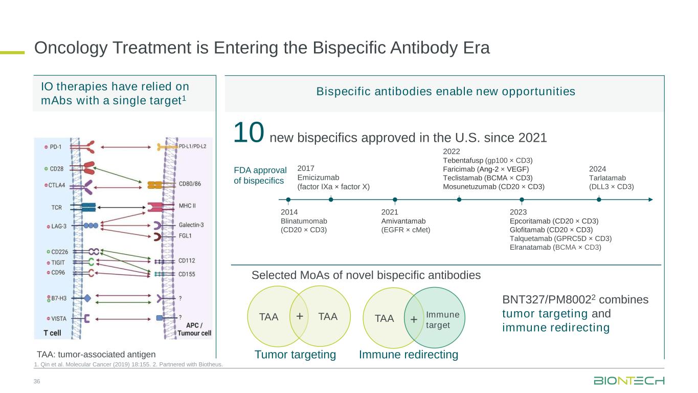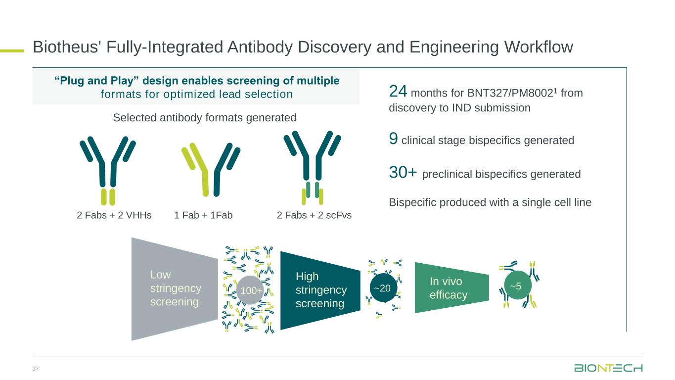 36 1. Qin et al. Molecular Cancer (2019) 18:155. 2. Partnered with Biotheus. Oncology Treatment is Entering the Bispecific Antibody Era IO therapies have relied on mAbs with a single target1 Bispecific antibodies enable new opportunities TAA: tumor-associated antigen 2014 Blinatumomab (CD20 × CD3) 2017 Emicizumab (factor IXa × factor X) 2021 Amivantamab (EGFR × cMet) 2022 Tebentafusp (gp100 × CD3) Faricimab (Ang-2 × VEGF) Teclistamab (BCMA × CD3) Mosunetuzumab (CD20 × CD3) 2023 Epcoritamab (CD20 × CD3) Glofitamab (CD20 × CD3) Talquetamab (GPRC5D × CD3) Elranatamab (BCMA × CD3) 2024 Tarlatamab (DLL3 × CD3) TAA TAA+ TAA + Immune target Selected MoAs of novel bispecific antibodies Tumor targeting Immune redirecting BNT327/PM80022 combines tumor targeting and immune redirecting 10 new bispecifics approved in the U.S. since 2021 FDA approval of bispecifics