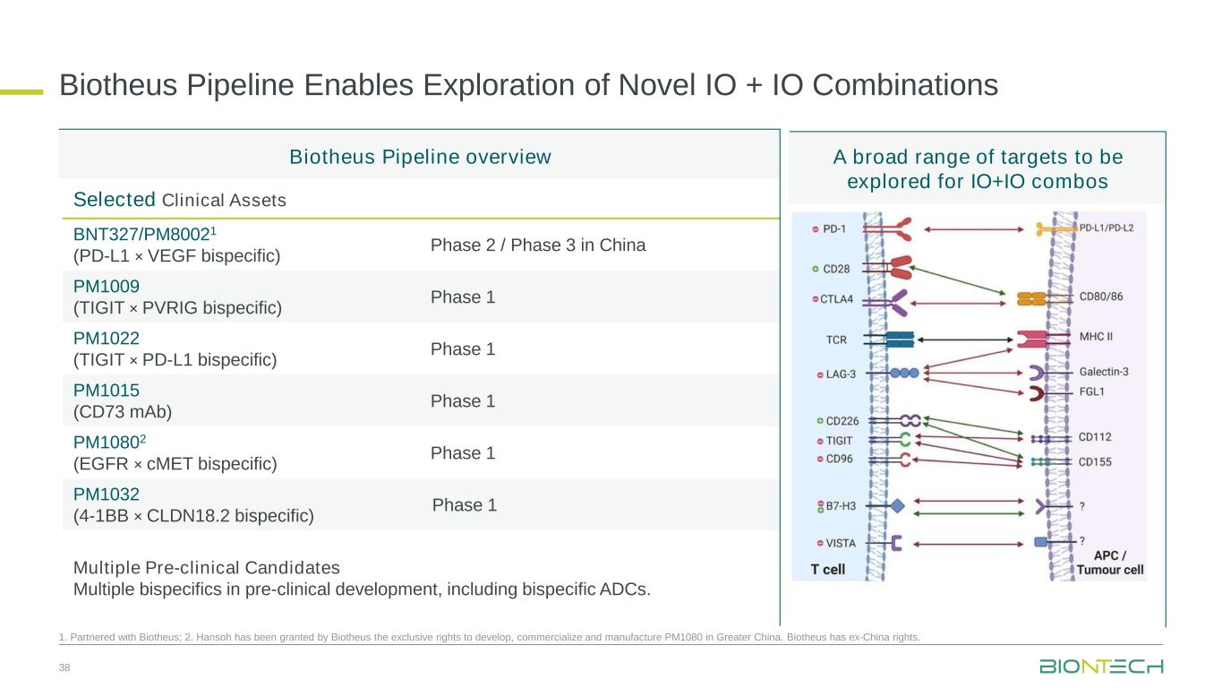 Biotheus' Fully-Integrated Antibody Discovery and Engineering Workflow 37 2 Fabs + 2 VHHs 1 Fab + 1Fab 2 Fabs + 2 scFvs “Plug and Play” design enables screening of multiple formats for optimized lead selection Selected antibody formats generated 100 - 1,000+ molecules Low stringency screening 100+ High stringency screening ~20 In vivo efficacy 24 months for BNT327/PM80021 from discovery to IND submission 9 clinical stage bispecifics generated 30+ preclinical bispecifics generated Bispecific produced with a single cell line ~5100+