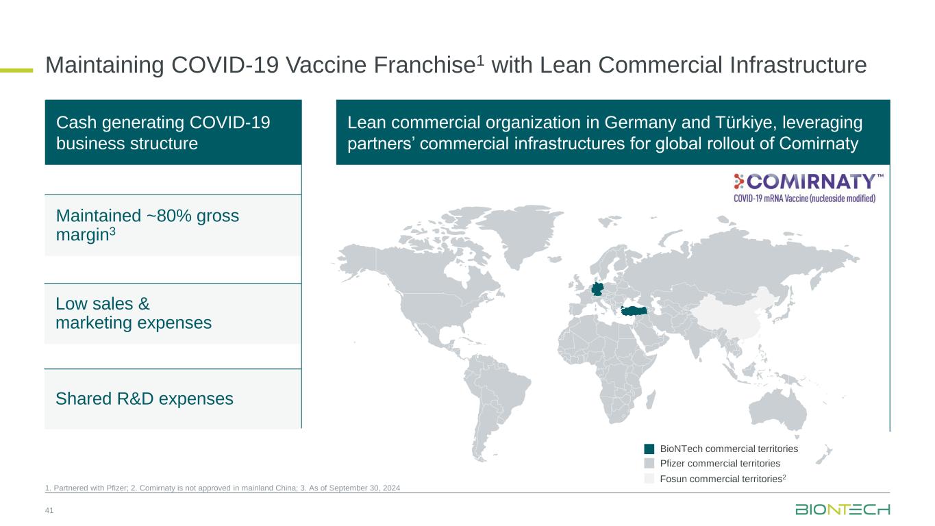 BioNTech is in Transition to a Multi-Product Commercial Oncology Company 40 Partnered with: 1. Pfizer; 2. DualityBio; 3. Biotheus; 4. Genentech, a member of the Roche Group; Patient numbers sourced from DRG; LCM = Lifecycle Management. Strategic launch sequence for oncology portfolio Comirnaty1 LCM >4.9 billion doses distributed Expand >400K patients Launch ~50K patients Establish 200K – 300K patients ’2026-’2027 ’2028+’2021 Comirnaty1 BNT327/PM80023 + ADC combinations Autogene cevumeran4 (Adj. PDAC, Adj. MIUC) Novel-novel combinations BNT327/PM80023 (1L SCLC, 1L NSCLC, 1L TNBC) Autogene cevumeran3 (Adj. CRC) BNT323/DB-13032 (2L EC and 2L BC)