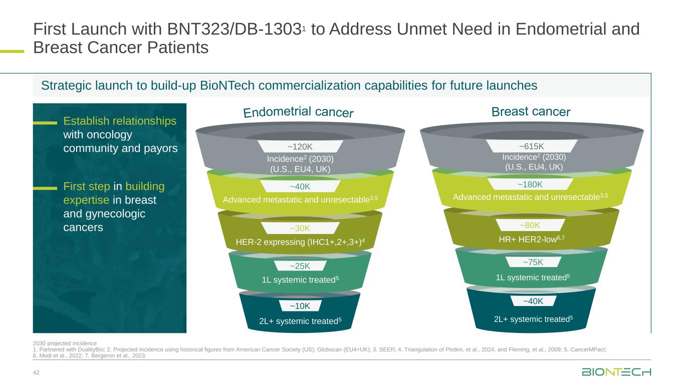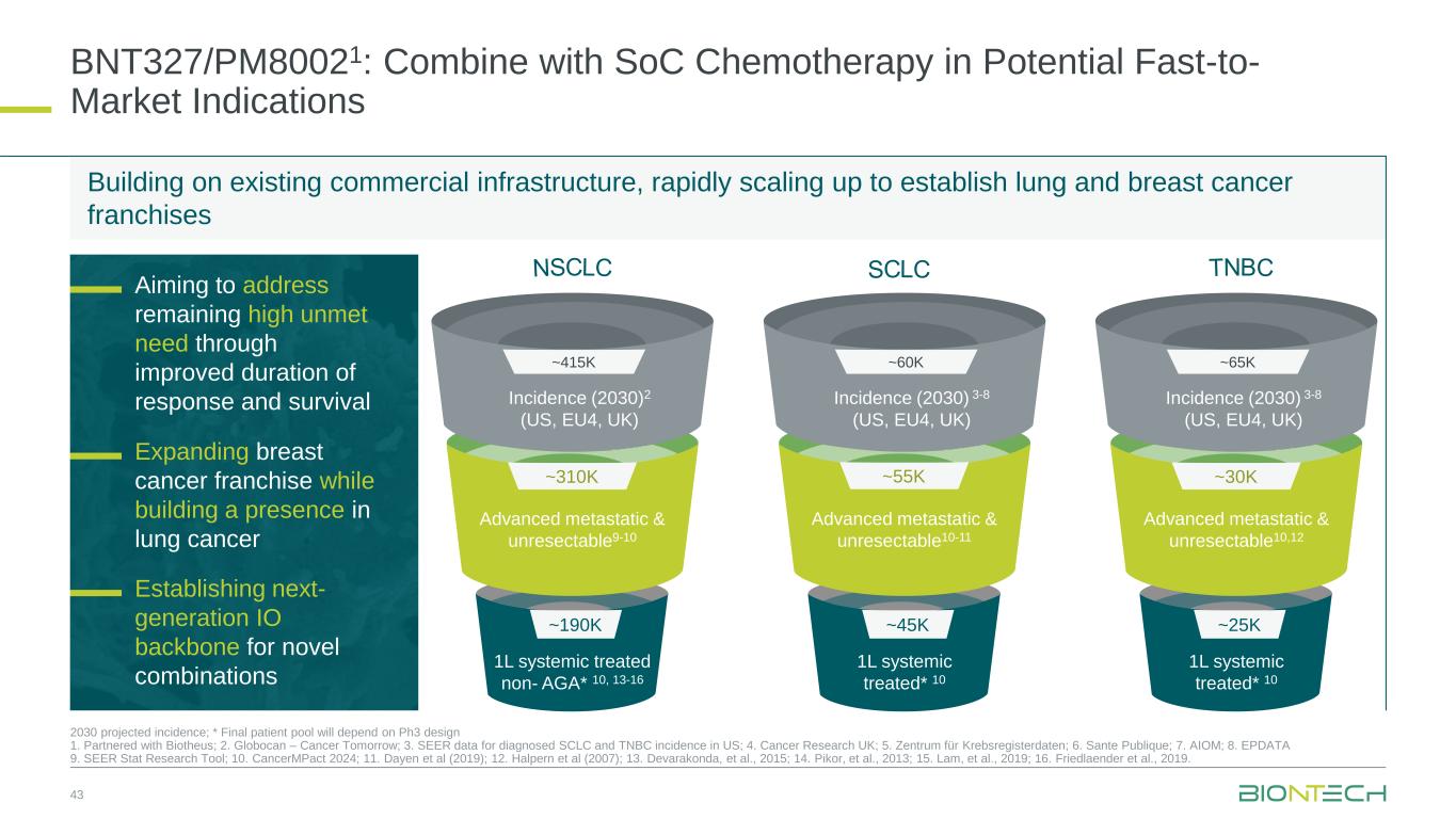 First Launch with BNT323/DB-13031 to Address Unmet Need in Endometrial and Breast Cancer Patients 42 2030 projected incidence 1. Partnered with DualityBio; 2. Projected incidence using historical figures from American Cancer Society (US); Globocan (EU4+UK); 3. SEER; 4. Triangulation of Plotkin, et al., 2024, and Fleming, et al., 2009; 5. CancerMPact; 6. Modi et al., 2022; 7. Bergeron et al., 2023. ~120K ~30K ~40K ~10K Incidence2 (2030) (U.S., EU4, UK) 1L systemic treated5 HER-2 expressing (IHC1+,2+,3+)4 Advanced metastatic and unresectable3,5 2L+ systemic treated5 ~25K Strategic launch to build-up BioNTech commercialization capabilities for future launches Establish relationships with oncology community and payors First step in building expertise in breast and gynecologic cancers ~615K ~80K ~180K ~75K Incidence2 (2030) (U.S., EU4, UK) 1L systemic treated5 HR+ HER2-low6,7 Advanced metastatic and unresectable3,5 2L+ systemic treated5 ~40K Endometrial cancer Breast cancer