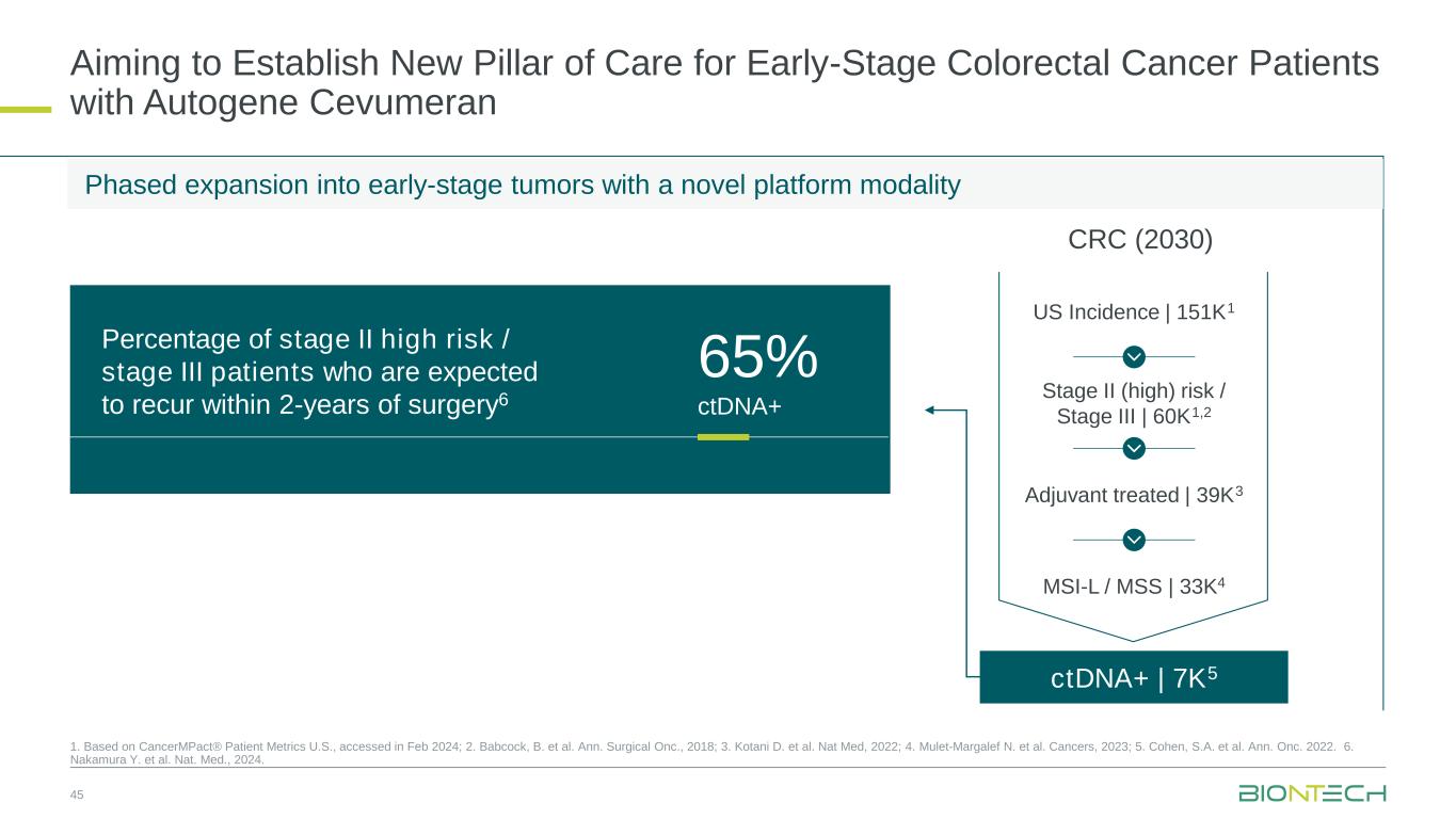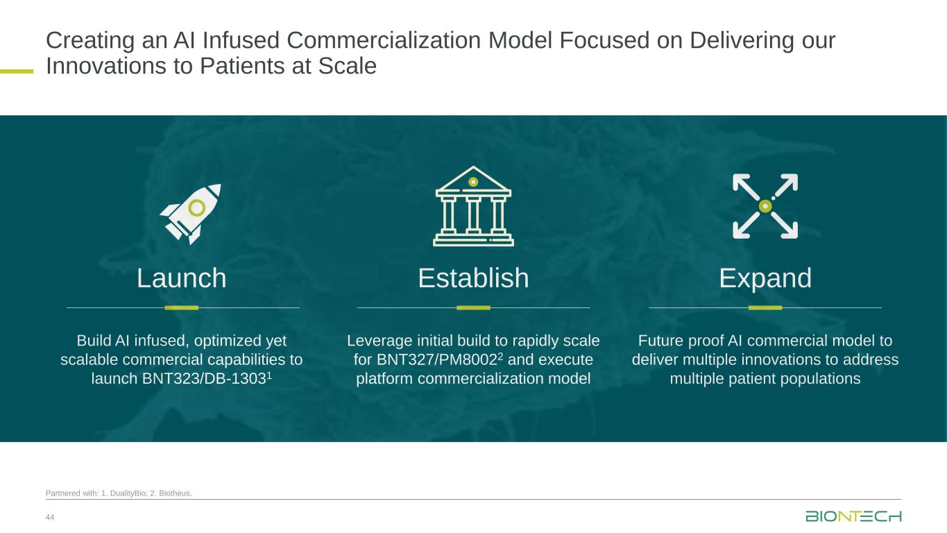 Creating an AI Infused Commercialization Model Focused on Delivering our Innovations to Patients at Scale Partnered with: 1. DualityBio; 2. Biotheus. Build AI infused, optimized yet scalable commercial capabilities to launch BNT323/DB-13031 Leverage initial build to rapidly scale for BNT327/PM80022 and execute platform commercialization model Future proof AI commercial model to deliver multiple innovations to address multiple patient populations Launch Establish Expand 44