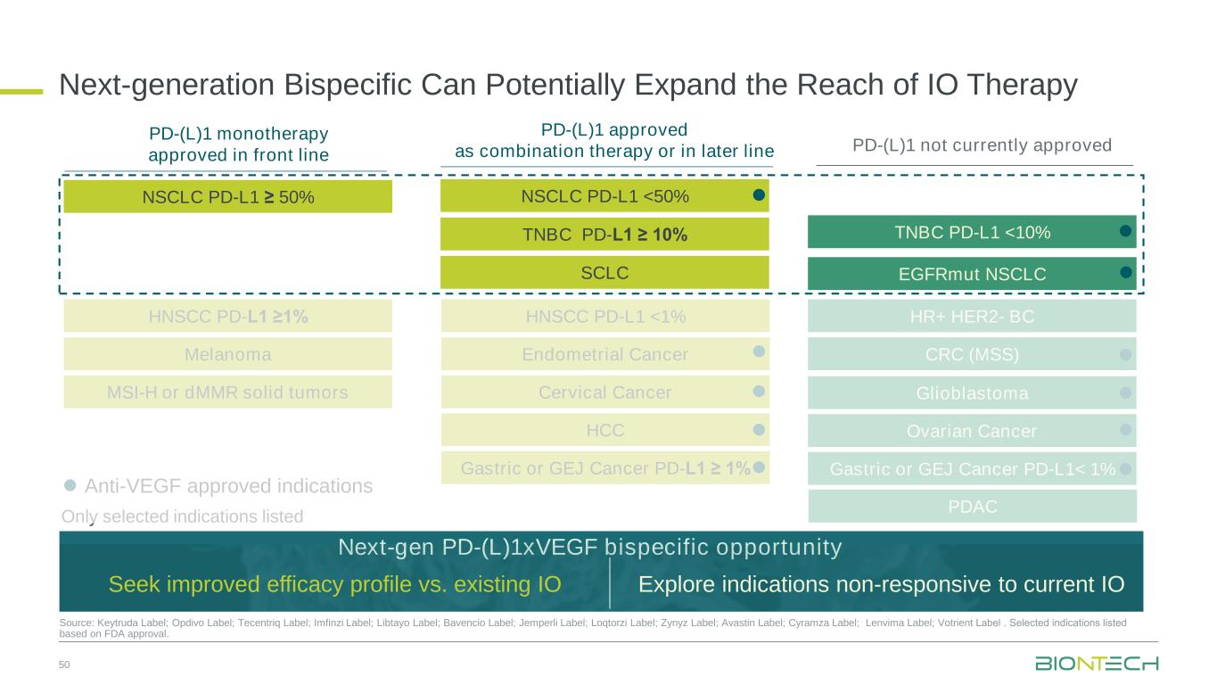Next-generation Bispecific Can Potentially Expand the Reach of IO Therapy 50 EGFRmut NSCLC Ovarian Cancer Melanoma HR+ HER2- BC MSI-H or dMMR solid tumors GlioblastomaCervical Cancer Endometrial Cancer SCLC Next-gen PD-(L)1xVEGF bispecific opportunity HCC HNSCC PD-L1 ≥1% HNSCC PD-L1 <1% NSCLC PD-L1 ≥ 50% NSCLC PD-L1 <50% TNBC PD-L1 <10%TNBC PD-L1 ≥ 10% Gastric or GEJ Cancer PD-L1< 1%Gastric or GEJ Cancer PD-L1 ≥ 1% PD-(L)1 monotherapy approved in front line PD-(L)1 approved as combination therapy or in later line PD-(L)1 not currently approved Only selected indications listed Anti-VEGF approved indications Source: Keytruda Label; Opdivo Label; Tecentriq Label; Imfinzi Label; Libtayo Label; Bavencio Label; Jemperli Label; Loqtorzi Label; Zynyz Label; Avastin Label; Cyramza Label; Lenvima Label; Votrient Label ​. Selected indications listed based on FDA approval. CRC (MSS) Seek improved efficacy profile vs. existing IO Explore indications non-responsive to current IO PDAC