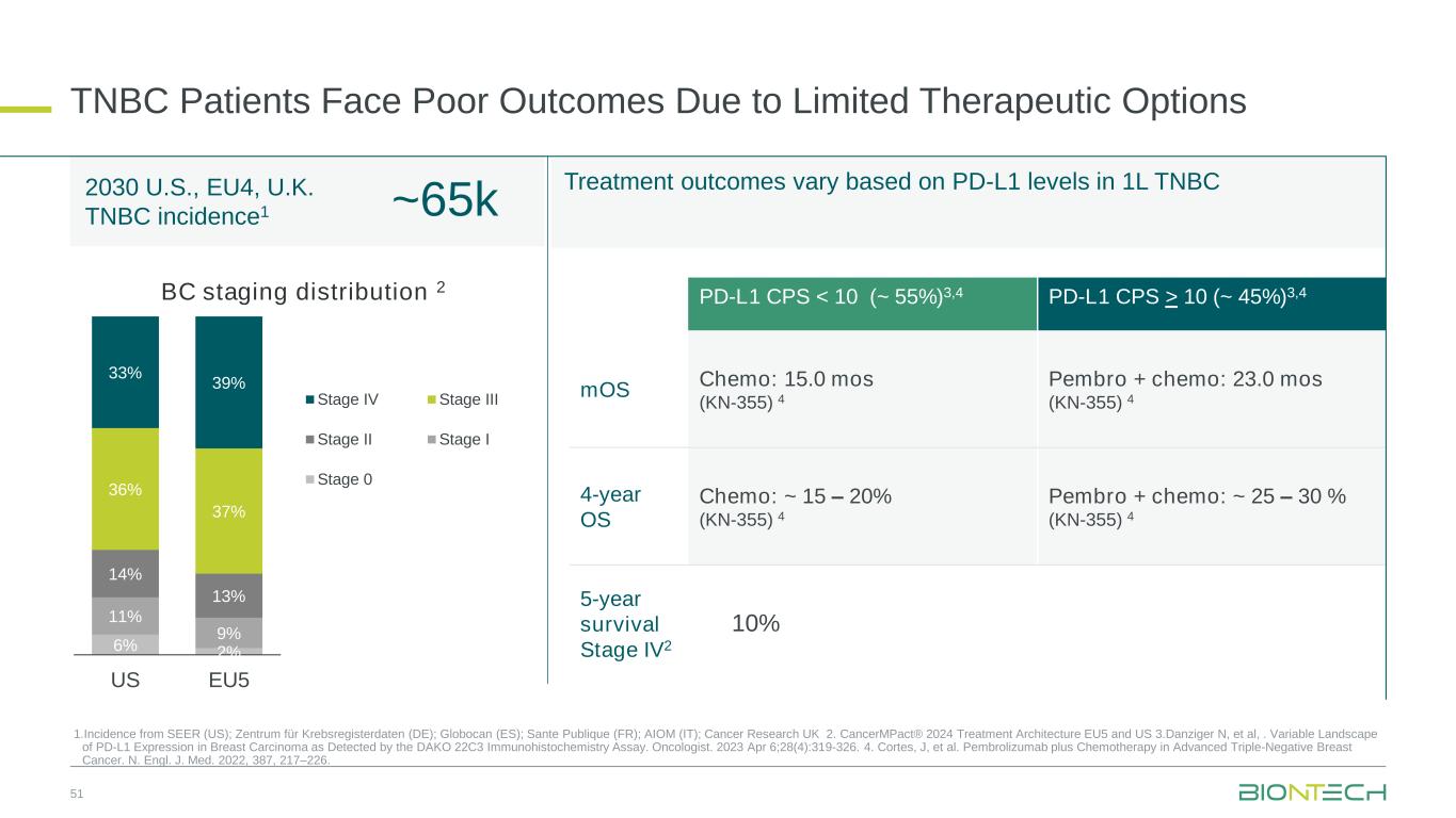 Treatment outcomes vary based on PD-L1 levels in 1L TNBC TNBC Patients Face Poor Outcomes Due to Limited Therapeutic Options 51 1.Incidence from SEER (US); Zentrum für Krebsregisterdaten (DE); Globocan (ES); Sante Publique (FR); AIOM (IT); Cancer Research UK 2. CancerMPact® 2024 Treatment Architecture EU5 and US 3.Danziger N, et al, . Variable Landscape of PD-L1 Expression in Breast Carcinoma as Detected by the DAKO 22C3 Immunohistochemistry Assay. Oncologist. 2023 Apr 6;28(4):319-326. 4. Cortes, J, et al. Pembrolizumab plus Chemotherapy in Advanced Triple-Negative Breast Cancer. N. Engl. J. Med. 2022, 387, 217–226. 6% 2% 11% 9% 14% 13% 36% 37% 33% 39% US EU5 Stage IV Stage III Stage II Stage I Stage 0 BC staging distribution 2 PD-L1 CPS < 10 (~ 55%)3,4 PD-L1 CPS > 10 (~ 45%)3,4 mOS Chemo: 15.0 mos (KN-355) 4 Pembro + chemo: 23.0 mos (KN-355) 4 4-year OS Chemo: ~ 15 – 20% (KN-355) 4 Pembro + chemo: ~ 25 – 30 % (KN-355) 4 5-year survival Stage IV2 ~65k2030 U.S., EU4, U.K. TNBC incidence1 10%