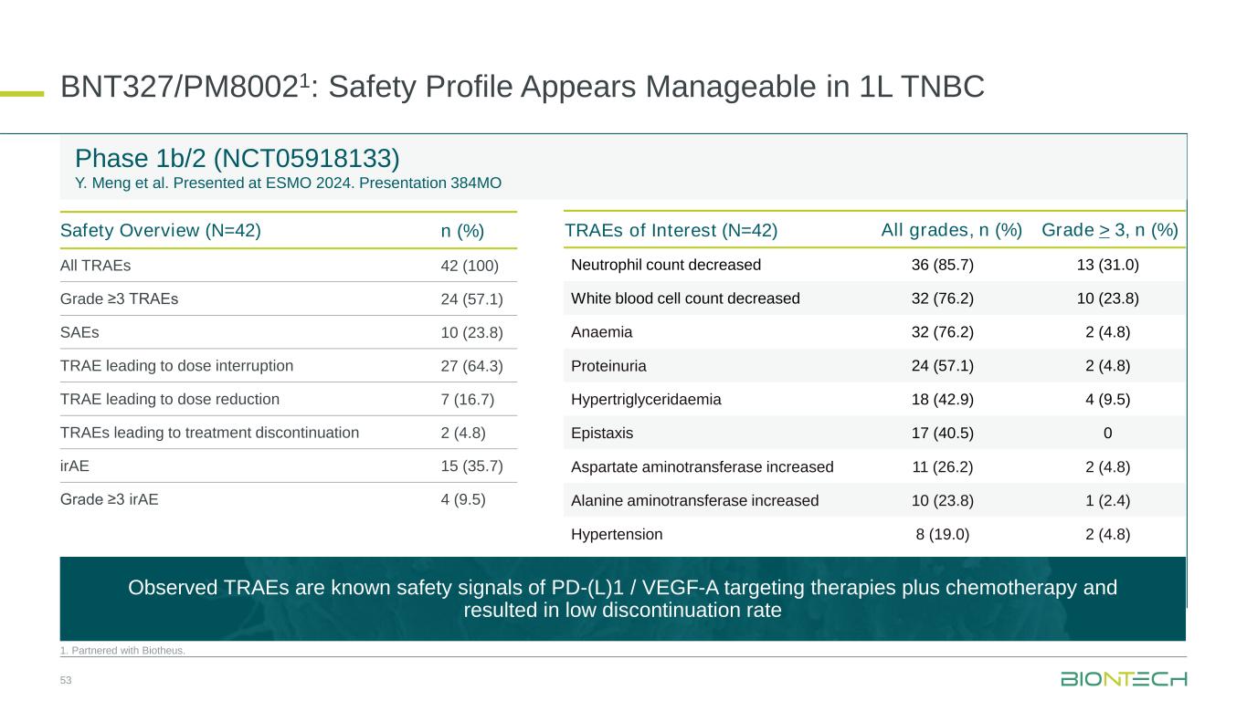BNT327/PM80021 in Combination with Nab-Paclitaxel for 1L Metastatic TNBC 52 1. Partnered with Biotheus; 2. J. Cortes et al, Pembrolizumab plus chemotherapy in advanced triple-negative breast cancer, N. Engl. J. Med. 387 (2020) pp 217-226; 3. Obtained from subgroup analysis. Key inclusion criteria • Age 18-75 years with life expectancy ≥ 12 weeks • Histologically or cytologically confirmed unresectable adv. or met. ER, PR, HER-2 negative TNBC • No prior systemic therapy despite taxane in (neo)adj. settings, ≥ 12 months • ≥ 1 measurable lesion (RECIST 1.1) • ECOG PS 0-1 • Adequate organ function Treatment continued until Disease progression or Unacceptable toxicity Primary endpoints: ORR per RECIST1.1, safety (NCI-CTCAE v5.0) Secondary endpoints: PFS, DCR, OS Key endpoints n=60 BNT327/PM80021 + Nab-paclitaxel Benchmark comparator data for 1L TNBC by PD-L1 expression level Indication Benchmark regimen ORR mPFS mOS Benchmark Study TNBC (CPS <10) Chemo 35% 5.6 mo 15.0 mo KEYNOTE-3552,3 TNBC (CPS >10) Pembro + Chemo 62% 9.7 mo 23.0 mo KEYNOTE-3552 Phase 1b/2 (NCT05918133) Y. Meng et al. Presented at ESMO 2024. Presentation 384MO