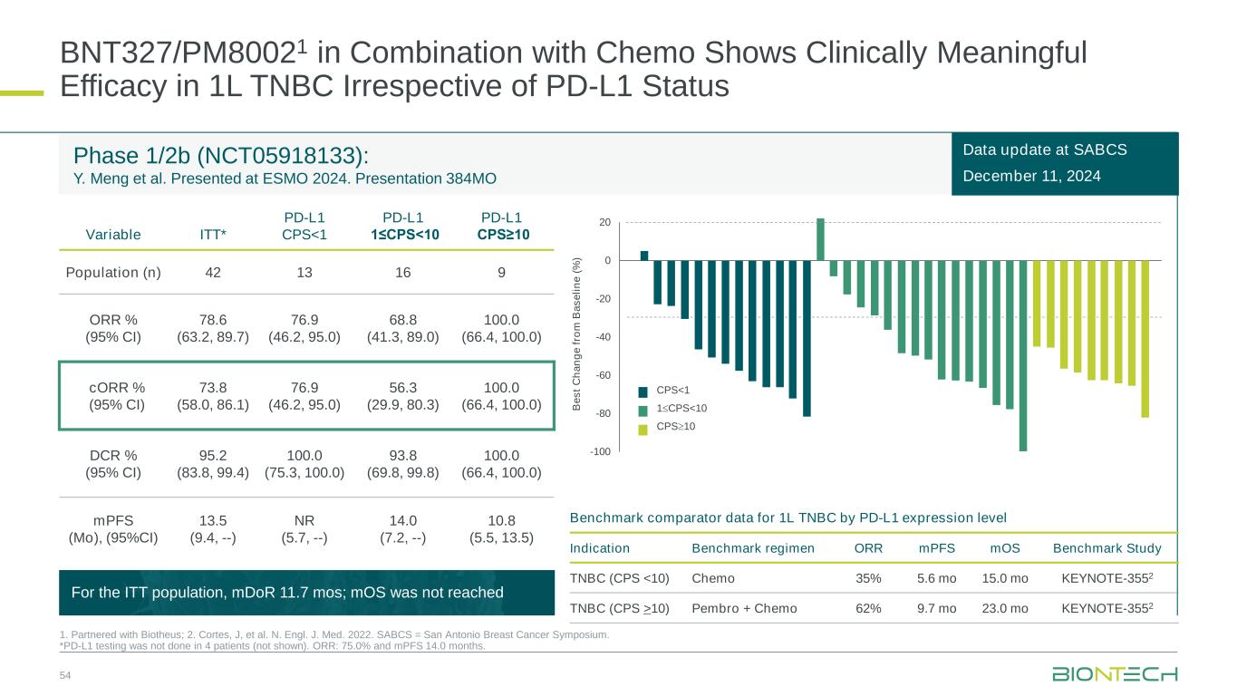 BNT327/PM80021: Safety Profile Appears Manageable in 1L TNBC 53 1. Partnered with Biotheus. Observed TRAEs are known safety signals of PD-(L)1 / VEGF-A targeting therapies plus chemotherapy and resulted in low discontinuation rate Safety Overview (N=42) n (%) All TRAEs 42 (100) Grade ≥3 TRAEs 24 (57.1) SAEs 10 (23.8) TRAE leading to dose interruption 27 (64.3) TRAE leading to dose reduction 7 (16.7) TRAEs leading to treatment discontinuation 2 (4.8) irAE 15 (35.7) Grade ≥3 irAE 4 (9.5) TRAEs of Interest (N=42) All grades, n (%) Grade > 3, n (%) Neutrophil count decreased 36 (85.7) 13 (31.0) White blood cell count decreased 32 (76.2) 10 (23.8) Anaemia 32 (76.2) 2 (4.8) Proteinuria 24 (57.1) 2 (4.8) Hypertriglyceridaemia 18 (42.9) 4 (9.5) Epistaxis 17 (40.5) 0 Aspartate aminotransferase increased 11 (26.2) 2 (4.8) Alanine aminotransferase increased 10 (23.8) 1 (2.4) Hypertension 8 (19.0) 2 (4.8) Phase 1b/2 (NCT05918133) Y. Meng et al. Presented at ESMO 2024. Presentation 384MO