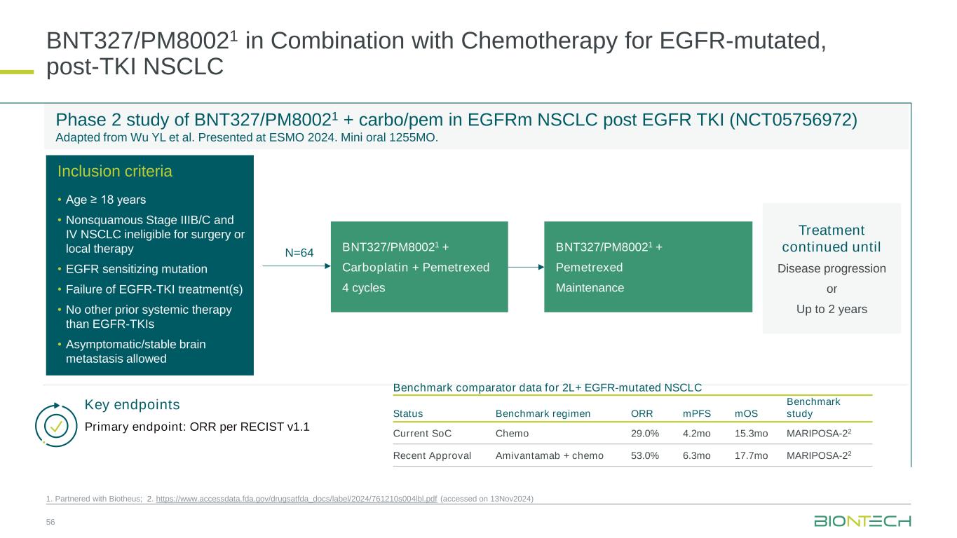 Arm 1 Arm 2 BNT327/PM80021 Phase 2 in Combination with Chemotherapy for 1L/2L Triple Negative Breast Cancer 55 BNT327-02 (NCT06449222) Key inclusion criteria • Histologically confirmed, la/ mTNBC • 1L or 2L • If recurrent, stage I-III BC, at least 6 months has elapsed between completion of treatment with curative intent • ECOG PS 0,1 BNT327/PM80021 dose level 1+ Taxane A BNT327/PM80021 dose level 2+ Taxane A 1:1 n=40 Selected dose from cohort 1 will be used in cohort 2 Arm 1 Arm 2 Investigator choice BNT327/PM80021 + Taxane B BNT327/PM80021 + Anti-metabolite + Alkylating agent 1. Partnered with Biotheus 2. Cortes, J, et al. N. Engl. J. Med. 2022.. Primary endpoints: ORR per RECIST v1.1 and safety according to NCI-CTCAE v5.0 Key endpoints Phase 3 trial planned for 2025 Benchmark comparator data for 1L TNBC by PD-L1 expression level Indication Benchmark regimen ORR mPFS mOS Benchmark Study TNBC (CPS <10) Chemo 35% 5.6 mo 15.0 mo KEYNOTE-3552 TNBC (CPS >10) Pembro + Chemo 62% 9.7 mo 23.0 mo KEYNOTE-3552