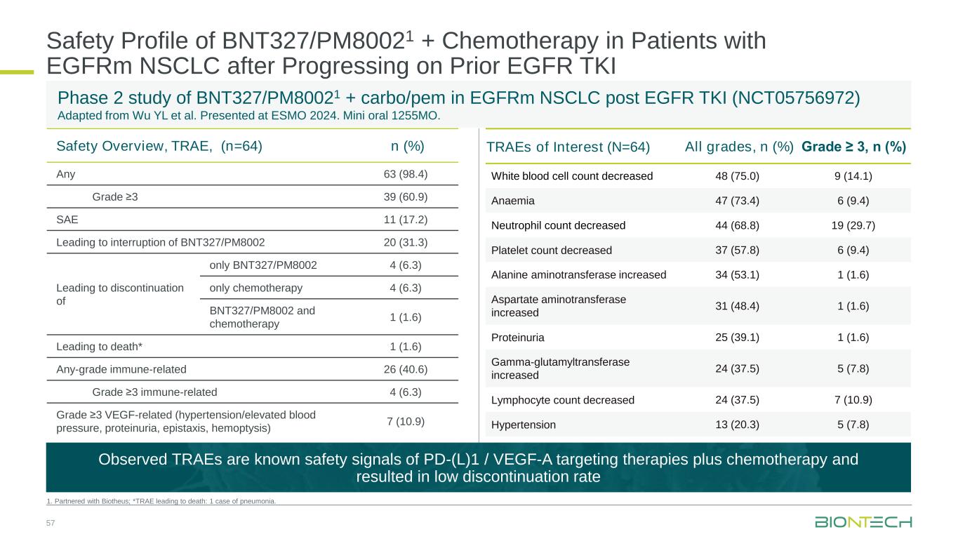 BNT327/PM80021 in Combination with Chemotherapy for EGFR-mutated, post-TKI NSCLC 56 1. Partnered with Biotheus; 2. https://www.accessdata.fda.gov/drugsatfda_docs/label/2024/761210s004lbl.pdf (accessed on 13Nov2024) BNT327/PM80021 + Carboplatin + Pemetrexed 4 cycles N=64 Inclusion criteria • Age ≥ 18 years • Nonsquamous Stage IIIB/C and IV NSCLC ineligible for surgery or local therapy • EGFR sensitizing mutation • Failure of EGFR-TKI treatment(s) • No other prior systemic therapy than EGFR-TKIs • Asymptomatic/stable brain metastasis allowed BNT327/PM80021 + Pemetrexed Maintenance Primary endpoint: ORR per RECIST v1.1 Key endpoints Benchmark comparator data for 2L+ EGFR-mutated NSCLC Status Benchmark regimen ORR mPFS mOS Benchmark study Current SoC Chemo 29.0% 4.2mo 15.3mo MARIPOSA-22 Recent Approval Amivantamab + chemo 53.0% 6.3mo 17.7mo MARIPOSA-22 Phase 2 study of BNT327/PM80021 + carbo/pem in EGFRm NSCLC post EGFR TKI (NCT05756972) Adapted from Wu YL et al. Presented at ESMO 2024. Mini oral 1255MO. Treatment continued until Disease progression or Up to 2 years
