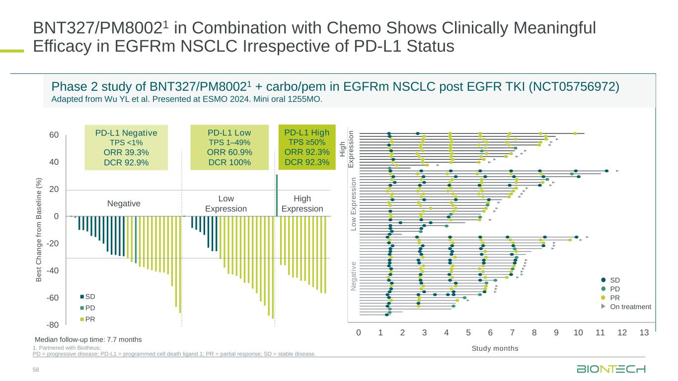 -80 -60 -40 -20 0 20 40 60 SD PD PR 58 1. Partnered with Biotheus; PD = progressive disease; PD-L1 = programmed cell death ligand 1; PR = partial response; SD = stable disease. B e s t C h a n g e f ro m B a s e li n e ( % ) Negative Low Expression High Expression Study months 0 1 2 3 4 5 6 7 8 9 10 11 12 13 PD SD PR On treatment N e g a ti v e L o w E x p re s s io n H ig h E x p re s s io n Median follow-up time: 7.7 months PD-L1 Negative TPS <1% ORR 39.3% DCR 92.9% PD-L1 High TPS ≥50% ORR 92.3% DCR 92.3% PD-L1 Low TPS 1–49% ORR 60.9% DCR 100% Phase 2 study of BNT327/PM80021 + carbo/pem in EGFRm NSCLC post EGFR TKI (NCT05756972) Adapted from Wu YL et al. Presented at ESMO 2024. Mini oral 1255MO. BNT327/PM80021 in Combination with Chemo Shows Clinically Meaningful Efficacy in EGFRm NSCLC Irrespective of PD-L1 Status