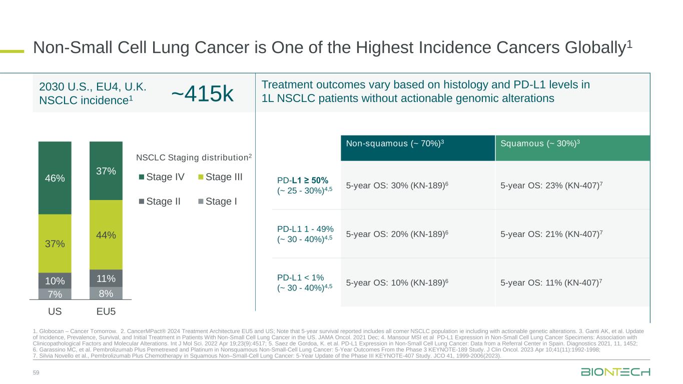 Treatment outcomes vary based on histology and PD-L1 levels in 1L NSCLC patients without actionable genomic alterations 7% 8% 10% 11% 37% 44% 46% 37% US EU5 Stage IV Stage III Stage II Stage I Non-Small Cell Lung Cancer is One of the Highest Incidence Cancers Globally1 59 1. Globocan – Cancer Tomorrow. 2. CancerMPact® 2024 Treatment Architecture EU5 and US; Note that 5-year survival reported includes all comer NSCLC population ie including with actionable genetic alterations. 3. Ganti AK, et al. Update of Incidence, Prevalence, Survival, and Initial Treatment in Patients With Non-Small Cell Lung Cancer in the US. JAMA Oncol. 2021 Dec; 4. Mansour MSI et al PD-L1 Expression in Non-Small Cell Lung Cancer Specimens: Association with Clinicopathological Factors and Molecular Alterations. Int J Mol Sci. 2022 Apr 19;23(9):4517; 5. Saez de Gordoa, K. et al. PD-L1 Expression in Non-Small Cell Lung Cancer: Data from a Referral Center in Spain. Diagnostics 2021, 11, 1452; 6. Garassino MC, et al. Pembrolizumab Plus Pemetrexed and Platinum in Nonsquamous Non-Small-Cell Lung Cancer: 5-Year Outcomes From the Phase 3 KEYNOTE-189 Study. J Clin Oncol. 2023 Apr 10;41(11):1992-1998; 7. Silvia Novello et al., Pembrolizumab Plus Chemotherapy in Squamous Non–Small-Cell Lung Cancer: 5-Year Update of the Phase III KEYNOTE-407 Study. JCO 41, 1999-2006(2023). ~415k 2030 U.S., EU4, U.K. NSCLC incidence1 NSCLC Staging distribution2 Non-squamous (~ 70%)3 Squamous (~ 30%)3 PD-L1 ≥ 50% (~ 25 - 30%)4,5 5-year OS: 30% (KN-189)6 5-year OS: 23% (KN-407)7 PD-L1 1 - 49% (~ 30 - 40%)4,5 5-year OS: 20% (KN-189)6 5-year OS: 21% (KN-407)7 PD-L1 < 1% (~ 30 - 40%)4,5 5-year OS: 10% (KN-189)6 5-year OS: 11% (KN-407)7