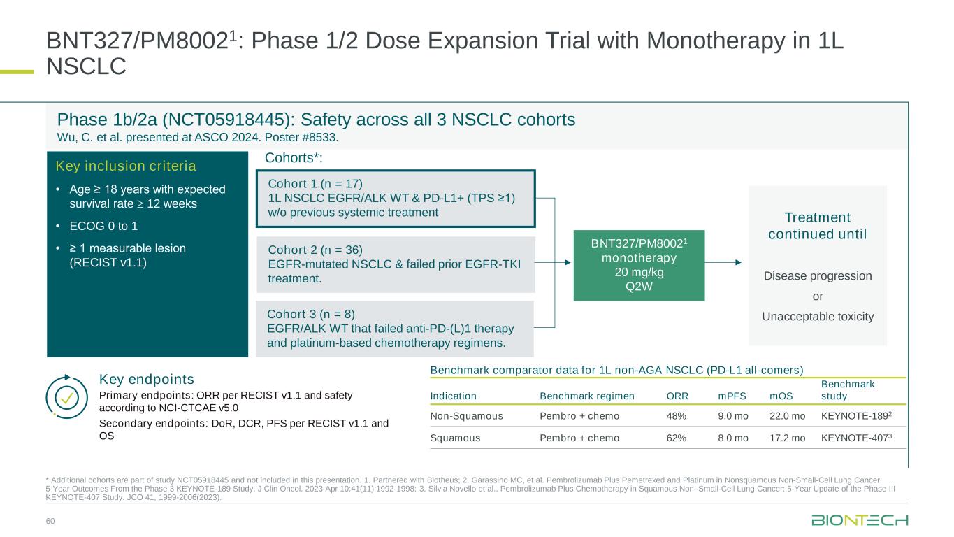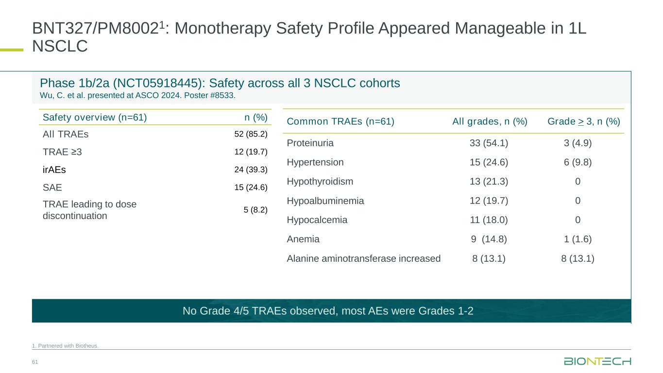 Phase 1b/2a (NCT05918445): Safety across all 3 NSCLC cohorts Wu, C. et al. presented at ASCO 2024. Poster #8533. * Additional cohorts are part of study NCT05918445 and not included in this presentation. 1. Partnered with Biotheus; 2. Garassino MC, et al. Pembrolizumab Plus Pemetrexed and Platinum in Nonsquamous Non-Small-Cell Lung Cancer: 5-Year Outcomes From the Phase 3 KEYNOTE-189 Study. J Clin Oncol. 2023 Apr 10;41(11):1992-1998; 3. Silvia Novello et al., Pembrolizumab Plus Chemotherapy in Squamous Non–Small-Cell Lung Cancer: 5-Year Update of the Phase III KEYNOTE-407 Study. JCO 41, 1999-2006(2023). 60 Key inclusion criteria • Age ≥ 18 years with expected survival rate  12 weeks • ECOG 0 to 1 • ≥ 1 measurable lesion (RECIST v1.1) Primary endpoints: ORR per RECIST v1.1 and safety according to NCI-CTCAE v5.0 Secondary endpoints: DoR, DCR, PFS per RECIST v1.1 and OS Key endpoints BNT327/PM80021 monotherapy 20 mg/kg Q2W Cohort 2 (n = 36) EGFR-mutated NSCLC & failed prior EGFR-TKI treatment. Cohort 1 (n = 17) 1L NSCLC EGFR/ALK WT & PD-L1+ (TPS ≥1) w/o previous systemic treatment Cohort 3 (n = 8) EGFR/ALK WT that failed anti-PD-(L)1 therapy and platinum-based chemotherapy regimens. Cohorts*: Treatment continued until Disease progression or Unacceptable toxicity Benchmark comparator data for 1L non-AGA NSCLC (PD-L1 all-comers) Indication Benchmark regimen ORR mPFS mOS Benchmark study Non-Squamous Pembro + chemo 48% 9.0 mo 22.0 mo KEYNOTE-1892 Squamous Pembro + chemo 62% 8.0 mo 17.2 mo KEYNOTE-4073 BNT327/PM80021: Phase 1/2 Dose Expansion Trial with Monotherapy in 1L NSCLC