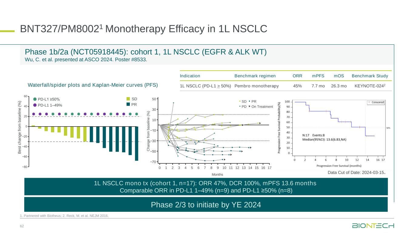 BNT327/PM80021: Monotherapy Safety Profile Appeared Manageable in 1L NSCLC 61 1. Partnered with Biotheus. Phase 1b/2a (NCT05918445): Safety across all 3 NSCLC cohorts Wu, C. et al. presented at ASCO 2024. Poster #8533. Safety overview (n=61) n (%) All TRAEs 52 (85.2) TRAE ≥3 12 (19.7) irAEs 24 (39.3) SAE 15 (24.6) TRAE leading to dose discontinuation 5 (8.2) Common TRAEs (n=61) All grades, n (%) Grade > 3, n (%) Proteinuria 33 (54.1) 3 (4.9) Hypertension 15 (24.6) 6 (9.8) Hypothyroidism 13 (21.3) 0 Hypoalbuminemia 12 (19.7) 0 Hypocalcemia 11 (18.0) 0 Anemia 9 (14.8) 1 (1.6) Alanine aminotransferase increased 8 (13.1) 8 (13.1) No Grade 4/5 TRAEs observed, most AEs were Grades 1-2