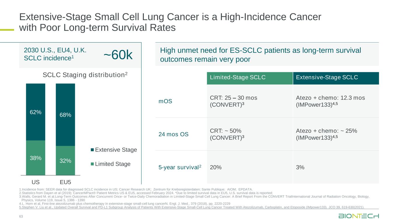 63 ~60k 2030 U.S., EU4, U.K. SCLC incidence1 1.Incidence from: SEER data for diagnosed SCLC incidence in US; Cancer Research UK; Zentrum für Krebsregisterdaten; Sante Publique; AIOM; EPDATA. 2.Statistics from Dayen et al (2019); CancerMPact® Patient Metrics US & EU5, accessed February 2024. *Due to limited survival data in EU5, U.S. survival data is reported; 3.Walls, Gerard M. et al.Long-Term Outcomes After Concurrent Once- or Twice-Daily Chemoradiation in Limited-Stage Small Cell Lung Cancer: A Brief Report From the CONVERT TrialInternational Journal of Radiation Oncology, Biology, Physics, Volume 119, Issue 5, 1386 - 1390 4.L. Horn et al, First-line atezolizumab plus chemotherapy in extensive-stage small-cell lung cancerN. Engl. J. Med., 379 (2018), pp. 2220-2229 5.Stephen V. Liu et al., Updated Overall Survival and PD-L1 Subgroup Analysis of Patients With Extensive-Stage Small-Cell Lung Cancer Treated With Atezolizumab, Carboplatin, and Etoposide (IMpower133). JCO 39, 619-630(2021). Extensive-Stage Small Cell Lung Cancer is a High-Incidence Cancer with Poor Long-term Survival Rates 38% 32% 62% 68% US EU5 Extensive Stage Limited Stage SCLC Staging distribution2 Limited-Stage SCLC Extensive-Stage SCLC mOS CRT: 25 – 30 mos (CONVERT)3 Atezo + chemo: 12.3 mos (IMPower133)4,5 24 mos OS CRT: ~ 50% (CONVERT)3 Atezo + chemo: ~ 25% (IMPower133)4,5 5-year survival2 20% 3% High unmet need for ES-SCLC patients as long-term survival outcomes remain very poor