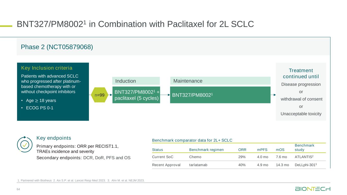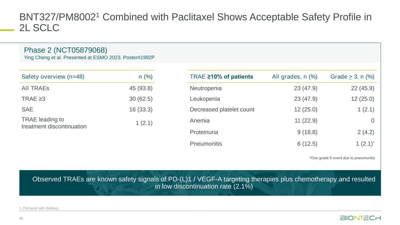 BNT327/PM80021 in Combination with Paclitaxel for 2L SCLC 64 1. Partnered with Biotheus 2. Aix S.P. et al. Lancet Resp Med 2023. 3. Ahn M. et al. NEJM 2023. Phase 2 (NCT05879068) Key Inclusion criteria Patients with advanced SCLC who progressed after platinum- based chemotherapy with or without checkpoint inhibitors • Age ≥ 18 years • ECOG PS 0-1 Treatment continued until Disease progression or withdrawal of consent or Unacceptable toxicity n=99 Primary endpoints: ORR per RECIST1.1, TRAEs incidence and severity Secondary endpoints: DCR, DoR, PFS and OS Key endpoints BNT327/PM80021BNT327/PM80021 + paclitaxel (5 cycles) Induction Maintenance Benchmark comparator data for 2L+ SCLC Status Benchmark regimen ORR mPFS mOS Benchmark study Current SoC Chemo 29% 4.0 mo 7.6 mo ATLANTIS2 Recent Approval tarlatamab 40% 4.9 mo 14.3 mo DeLLphi-3013