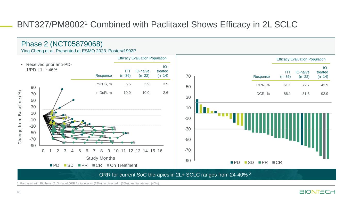 BNT327/PM80021 Combined with Paclitaxel Shows Acceptable Safety Profile in 2L SCLC 65 1. Partnered with Biotheus. Phase 2 (NCT05879068) Ying Cheng et al. Presented at ESMO 2023. Poster#1992P PD-L1 expression in tumors may enrich and focus VEGF neutralization into the TME sparing normal tissue and leading to reduced systemic toxicity Blocking VEGF inhibits the development of angiogenesis impeding tumor growth Study week Safety overview (n=48) n (%) All TRAEs 45 (93.8) TRAE ≥3 30 (62.5) SAE 16 (33.3) TRAE leading to treatment discontinuation 1 (2.1) TRAE ≥10% of patients All grades, n (%) Grade > 3, n (%) Neutropenia 23 (47.9) 22 (45.9) Leukopenia 23 (47.9) 12 (25.0) Decreased platelet count 12 (25.0) 1 (2.1) Anemia 11 (22.9) 0 Proteinuria 9 (18.8) 2 (4.2) Pneumonitis 6 (12.5) 1 (2.1)* *One grade 5 event due to pneumonitis Observed TRAEs are known safety signals of PD-(L)1 / VEGF-A t rgeti g therapie plus chemoth rapy and resulted in low discontinuation rate (2.1%)