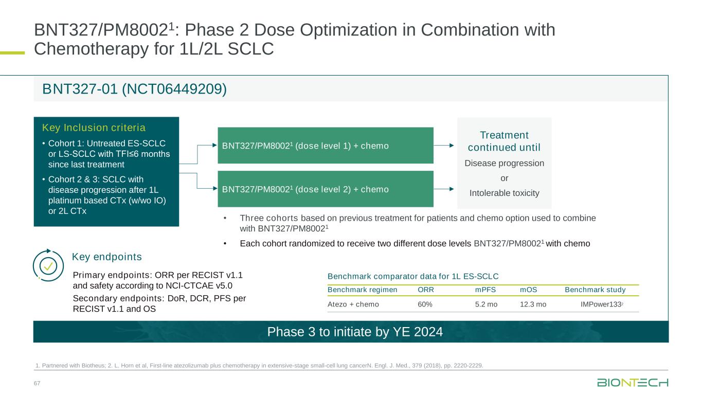 C h a n g e f ro m B a s e li n e ( % ) Response Efficacy Evaluation Population ITT (n=36) IO-naïve (n=22) IO- treated (n=14) ORR, % 61.1 72.7 42.9 DCR, % 86.1 81.8 92.9 Phase 2 (NCT05879068) Ying Cheng et al. Presented at ESMO 2023. Poster#1992P BNT327/PM80021 Combined with Paclitaxel Shows Efficacy in 2L SCLC 66 1. Partnered with Biotheus; 2. On-label ORR for topotecan (24%), lurbinectedin (35%), and tarlatamab (40%). -90 -70 -50 -30 -10 10 30 50 70 PD SD PR CR -90 -70 -50 -30 -10 10 30 50 70 90 0 1 2 3 4 5 6 7 8 9 10 11 12 13 14 15 16 PD SD PR CR On Treatment Study Months Response Efficacy Evaluation Population ITT (n=36) IO-naïve (n=22) IO- treated (n=14) mPFS, m 5.5 5.9 3.9 mDoR, m 10.0 10.0 2.6 • Received prior anti-PD- 1/PD-L1 : ~46% ORR for current SoC therapies in 2L+ SCLC ranges from 24-40% 2