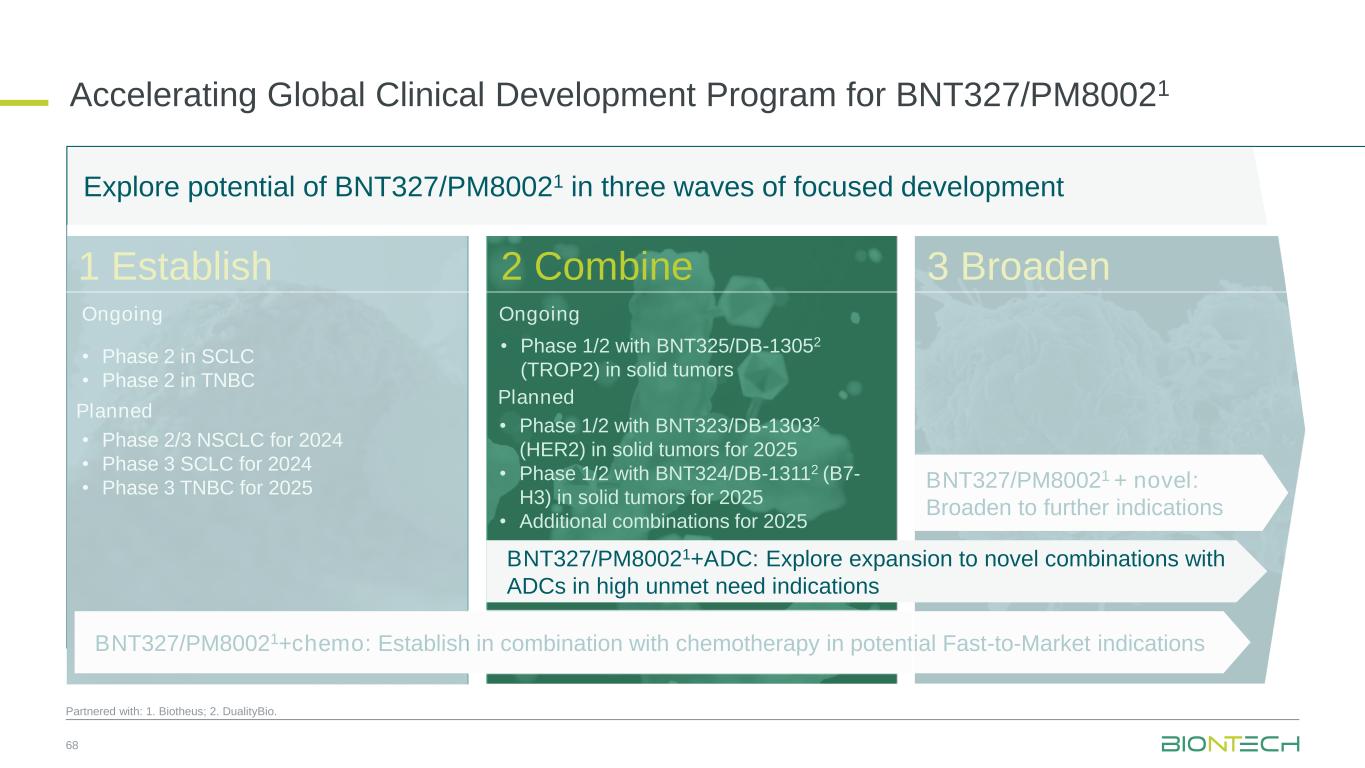 BNT327/PM80021: Phase 2 Dose Optimization in Combination with Chemotherapy for 1L/2L SCLC 67 1. Partnered with Biotheus; 2. L. Horn et al, First-line atezolizumab plus chemotherapy in extensive-stage small-cell lung cancerN. Engl. J. Med., 379 (2018), pp. 2220-2229. BNT327-01 (NCT06449209) Key Inclusion criteria • Cohort 1: Untreated ES-SCLC or LS-SCLC with TFI≤6 months since last treatment • Cohort 2 & 3: SCLC with disease progression after 1L platinum based CTx (w/wo IO) or 2L CTx BNT327/PM80021 (dose level 1) + chemo BNT327/PM80021 (dose level 2) + chemo • Three cohorts based on previous treatment for patients and chemo option used to combine with BNT327/PM80021 • Each cohort randomized to receive two different dose levels BNT327/PM80021 with chemo Treatment continued until Disease progression or Intolerable toxicity Primary endpoints: ORR per RECIST v1.1 and safety according to NCI-CTCAE v5.0 Secondary endpoints: DoR, DCR, PFS per RECIST v1.1 and OS Key endpoints Phase 3 to initiate by YE 2024 Benchmark comparator data for 1L ES-SCLC Benchmark regimen ORR mPFS mOS Benchmark study Atezo + chemo 60% 5.2 mo 12.3 mo IMPower1332