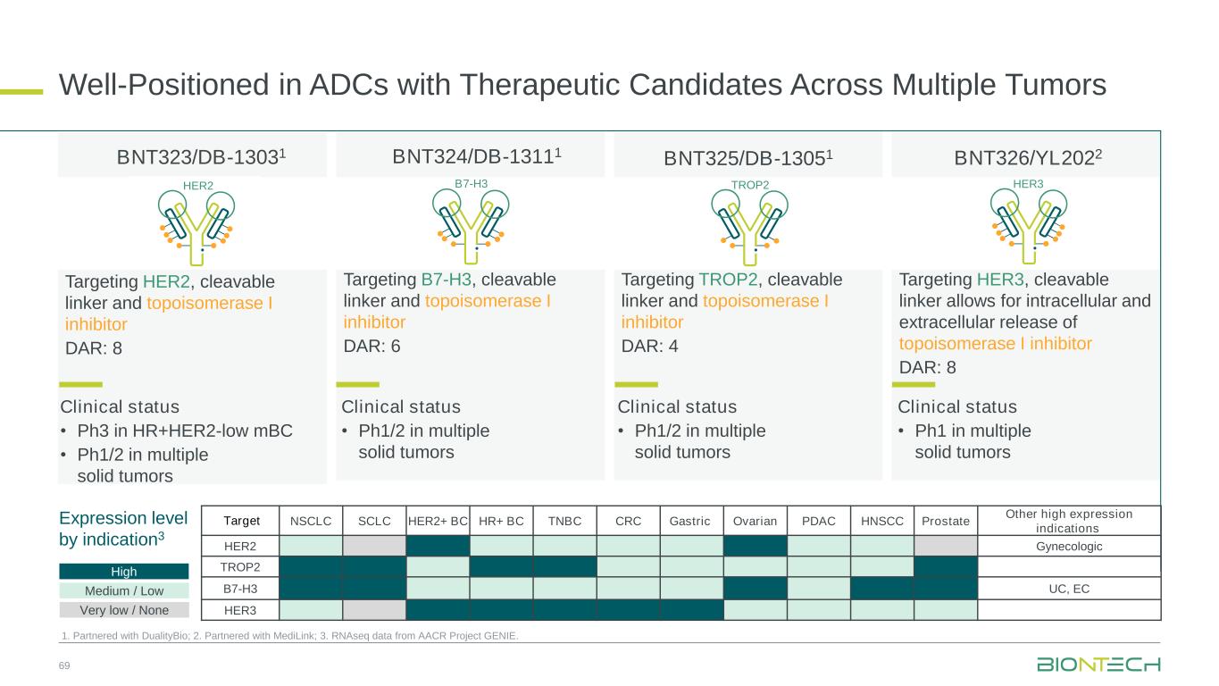 Accelerating Global Clinical Development Program for BNT327/PM80021 Partnered with: 1. Biotheus; 2. DualityBio. Explore potential of BNT327/PM80021 in three waves of focused development • Phase 2 in SCLC • Phase 2 in TNBC Ongoing Planned • Phase 2/3 NSCLC for 2024 • Phase 3 SCLC for 2024 • Phase 3 TNBC for 2025 3 Broaden2 Combine1 Establish Ongoing Planned 68 • Phase 1/2 with BNT323/DB-13032 (HER2) in solid tumors for 2025 • Phase 1/2 with BNT324/DB-13112 (B7- H3) in solid tumors for 2025 • Additional combinations for 2025 • Phase 1/2 with BNT325/DB-13052 (TROP2) in solid tumors BNT327/PM80021+chemo: Establish in combination with chemotherapy in potential Fast-to-Market indications BNT327/PM80021 + novel: Broaden to further indications BNT327/PM80021+ADC: Explore expansion to novel combinations with ADCs in high unmet need indications