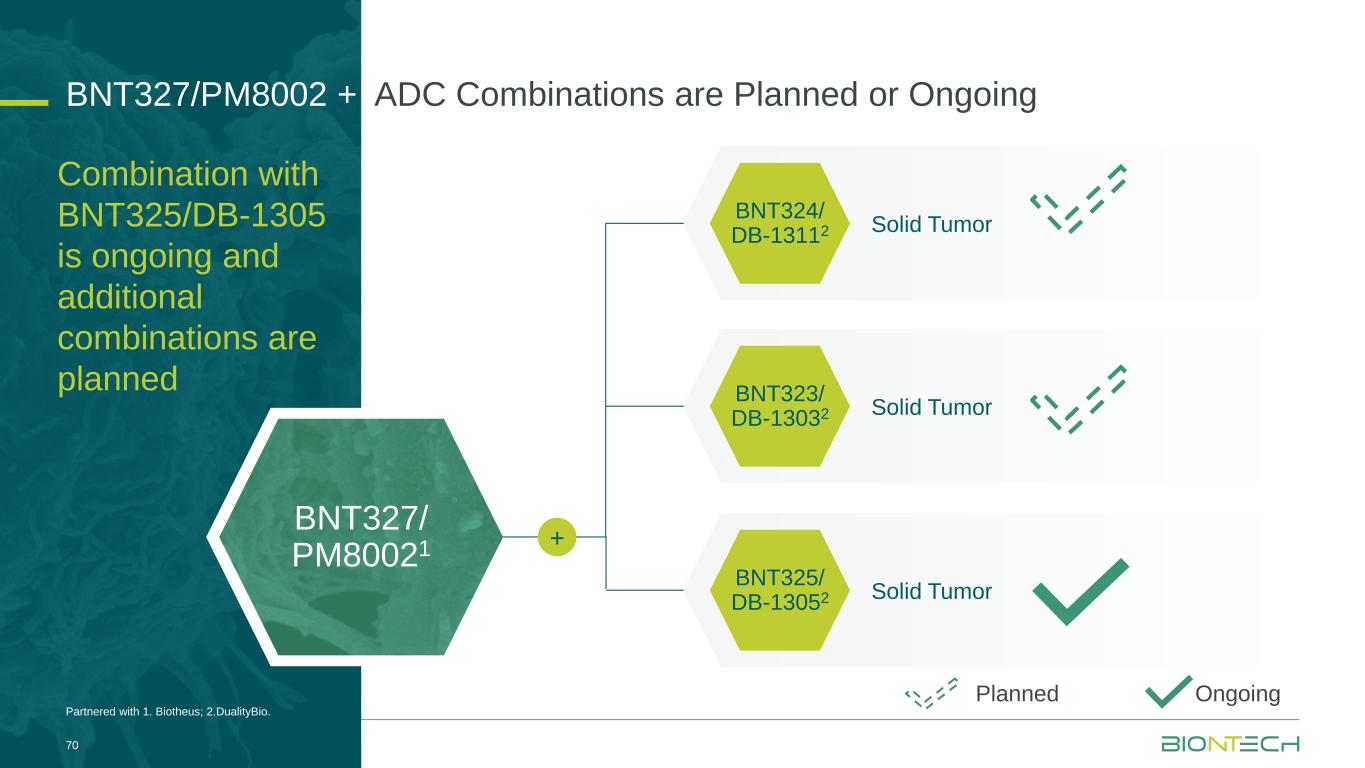 BNT327/PM8002 + ADC Combinations are Planned or Ongoing 70 Combination with BNT325/DB-1305 is ongoing and additional combinations are planned Solid Tumor BNT324/ DB-13112 Solid Tumor BNT323/ DB-13032 BNT327/ PM80021 + Solid Tumor BNT325/ DB-13052 OngoingPlanned Partnered with 1. Biotheus; 2.DualityBio.