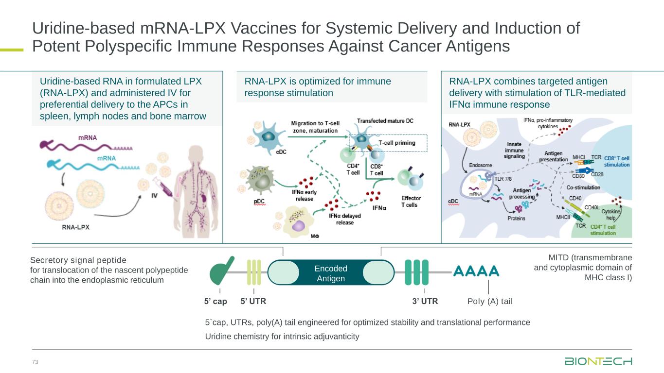 Uridine-based mRNA-LPX Vaccines for Systemic Delivery and Induction of Potent Polyspecific Immune Responses Against Cancer Antigens 73 Uridine-based RNA in formulated LPX (RNA-LPX) and administered IV for preferential delivery to the APCs in spleen, lymph nodes and bone marrow RNA-LPX is optimized for immune response stimulation RNA-LPX combines targeted antigen delivery with stimulation of TLR-mediated IFNα immune response Secretory signal peptide for translocation of the nascent polypeptide chain into the endoplasmic reticulum MITD (transmembrane and cytoplasmic domain of MHC class I) Encoded Antigen 5’ UTR5’ cap 3’ UTR Poly (A) tail 5`cap, UTRs, poly(A) tail engineered for optimized stability and translational performance Uridine chemistry for intrinsic adjuvanticity