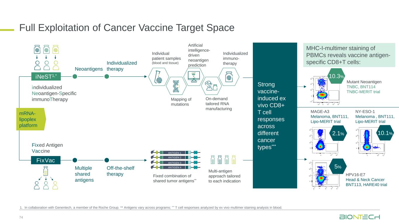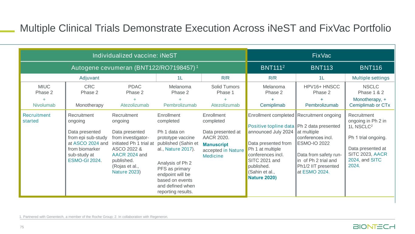 74 1. In collaboration with Genentech, a member of the Roche Group. ** Antigens vary across programs; *** T cell responses analyzed by ex vivo multimer staining analysis in blood. Individual patient samples (blood and tissue) Artificial intelligence- driven neoantigen prediction On-demand tailored RNA manufacturing Individualized immuno- therapy Mapping of mutations Fixed combination of shared tumor antigens** Multi-antigen approach tailored to each indication Neoantigens Individualized therapy Multiple shared antigens Off-the-shelf therapy iNeST1,* FixVac individualized Neoantigen-Specific immunoTherapy Fixed Antigen Vaccine ANTIGEN 1 ANTIGEN 2 ANTIGEN 3 ANTIGEN 4 Strong vaccine- induced ex vivo CD8+ T cell responses across different cancer types*** 10.3% 10.1% HPV16-E7 Head & Neck Cancer BNT113, HARE40 trial Mutant Neoantigen TNBC, BNT114 TNBC-MERIT trial 5% MAGE-A3 Melanoma, BNT111, Lipo-MERIT trial 2.1% NY-ESO-1 Melanoma , BNT111, Lipo-MERIT trial mRNA- lipoplex platform MHC-I-multimer staining of PBMCs reveals vaccine antigen- specific CD8+T cells: Full Exploitation of Cancer Vaccine Target Space