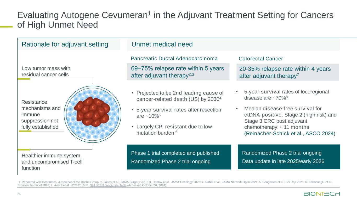 Multiple Clinical Trials Demonstrate Execution Across iNeST and FixVac Portfolio 75 1. Partnered with Genentech, a member of the Roche Group; 2. In collaboration with Regeneron. Individualized vaccine: iNeST FixVac Autogene cevumeran (BNT122/RO7198457) 1 BNT1112 BNT113 BNT116 Adjuvant 1L R/R R/R 1L Multiple settings MIUC Phase 2 CRC Phase 2 PDAC Phase 2 Melanoma Phase 2 Solid Tumors Phase 1 Melanoma Phase 2 HPV16+ HNSCC Phase 2 NSCLC Phase 1 & 2 + Nivolumab Monotherapy + Atezolizumab + Pembrolizumab + Atezolizumab + Cemiplimab + Pembrolizumab Monotherapy, + Cemiplimab or CTx Recruitment started Recruitment ongoing Data presented from epi sub-study at ASCO 2024 and from biomarker sub-study at ESMO-GI 2024. Recruitment ongoing Data presented from investigator- initiated Ph 1 trial at ASCO 2022 & AACR 2024 and published. (Rojas et al., Nature 2023) Enrollment completed Ph 1 data on prototype vaccine published (Sahin et al., Nature 2017). Analysis of Ph 2 PFS as primary endpoint will be based on events and defined when reporting results. Enrollment completed Data presented at AACR 2020. Manuscript ​ accepted in Nature Medicine Enrollment completed Positive topline data announced July 2024​ Data presented from Ph 1 at multiple conferences incl. SITC 2021 and published. (Sahin et al., Nature 2020)​ Recruitment ongoing Ph 2 data presented at multiple conferences incl.​ ESMO-IO 2022 Data from safety run- in of Ph 2 trial and Ph1/2 IIT presented at ESMO 2024. Recruitment ongoing in Ph 2 in 1L NSCLC2 Ph 1 trial ongoing. ​ Data presented at SITC 2023, AACR 2024​, and SITC 2024.