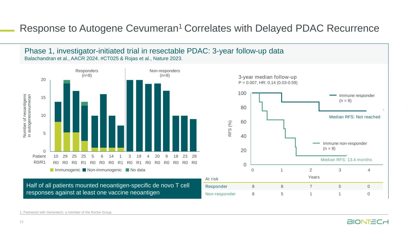 Evaluating Autogene Cevumeran1 in the Adjuvant Treatment Setting for Cancers of High Unmet Need 76 Rationale for adjuvant setting Low tumor mass with residual cancer cells Healthier immune system and uncompromised T-cell function Resistance mechanisms and immune suppression not fully established Pancreatic Ductal Adenocarcinoma 69−75% relapse rate within 5 years after adjuvant therapy2,3 • Projected to be 2nd leading cause of cancer-related death (US) by 20304 • 5-year survival rates after resection are ~10%5 • Largely CPI resistant due to low mutation burden 6 Phase 1 trial completed and published Randomized Phase 2 trial ongoing 20-35% relapse rate within 4 years after adjuvant therapy7 • 5-year survival rates of locoregional disease are ~70%8 • Median disease-free survival for ctDNA-positive, Stage 2 (high risk) and Stage 3 CRC post adjuvant chemotherapy: ≈ 11 months (Reinacher-Schick et al., ASCO 2024) Randomized Phase 2 trial ongoing Data update in late 2025/early 2026 Colorectal Cancer Unmet medical need 1. Partnered with Genentech, a member of the Roche Group; 2. Jones et al., JAMA Surgery 2019; 3. Conroy et al., JAMA Oncology 2022; 4. Rahib et al., JAMA Network Open 2021; 5. Bengtsson et al., Sci Rep 2020; 6. Kabacaoglu et al., Frontiers Immunol 2018; 7. André et al., JCO 2015; 8. NIH SEER cancer stat facts (Accessed October 30, 2024).