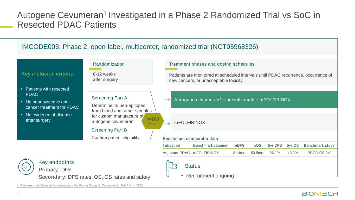 Autogene Cevumeran1 Investigated in a Phase 2 Randomized Trial vs SoC in Resected PDAC Patients 78 1. Partnered with Genentech, a member of the Roche Group; 2. Conroy et al,. JAMA Onc. 2022. Key endpoints Primary: DFS Secondary: DFS rates, OS, OS rates and safety Status • Recruitment ongoing Key inclusion criteria Screening Part A Determine 5 neo-epitopes from blood and tumor samples for custom manufacture of autogene cevumeran Screening Part B Confirm patient eligibility n=260 R 1:1 Treatment phases and dosing schedules Patients are monitored at scheduled intervals until PDAC recurrence, occurrence of new cancers, or unacceptable toxicity. Randomization 6-12 weeks after surgery Autogene cevumeran1 + atezolizumab + mFOLFIRINOX mFOLFIRINOX IMCODE003: Phase 2, open-label, multicenter, randomized trial (NCT05968326) • Patients with resected PDAC • No prior systemic anti- cancer treatment for PDAC • No evidence of disease after surgery Benchmark comparator data Indication Benchmark regimen mDFS mOS 5yr DFS 5yr OS Benchmark study Adjuvant PDAC mFOLFIRINOX 21.4mo 53.5mo 26.1% 43.2% PRODIGE 242