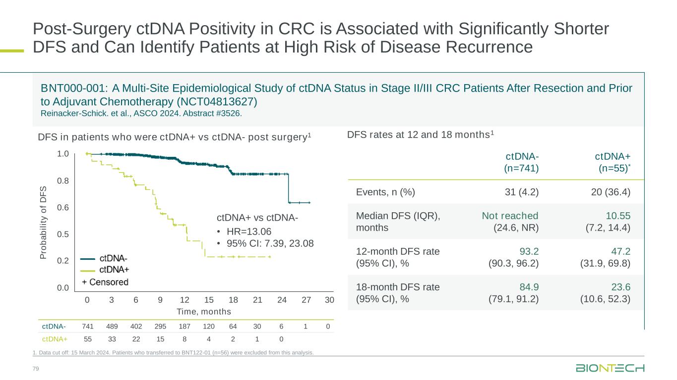 ctDNA- (n=741) ctDNA+ (n=55)* Events, n (%) 31 (4.2) 20 (36.4) Median DFS (IQR), months Not reached (24.6, NR) 10.55 (7.2, 14.4) 12-month DFS rate (95% CI), % 93.2 (90.3, 96.2) 47.2 (31.9, 69.8) 18-month DFS rate (95% CI), % 84.9 (79.1, 91.2) 23.6 (10.6, 52.3) 79 1. Data cut off: 15 March 2024. Patients who transferred to BNT122-01 (n=56) were excluded from this analysis. DFS rates at 12 and 18 months1 DFS in patients who were ctDNA+ vs ctDNA- post surgery1 ctDNA- 741 489 402 295 187 120 64 30 6 1 0 ctDNA+ 55 33 22 15 8 4 2 1 0 P ro b a b il it y o f D F S Time, months 0.0 0.2 0.5 0.6 0.8 1.0 0 3 6 9 12 15 18 21 24 27 30 BNT000-001: A Multi-Site Epidemiological Study of ctDNA Status in Stage II/III CRC Patients After Resection and Prior to Adjuvant Chemotherapy (NCT04813627) Reinacker-Schick. et al., ASCO 2024. Abstract #3526. Post-Surgery ctDNA Positivity in CRC is Associated with Significantly Shorter DFS and Can Identify Patients at High Risk of Disease Recurrence ctDNA+ vs ctDNA- • HR=13.06 • 95% CI: 7.39, 23.08