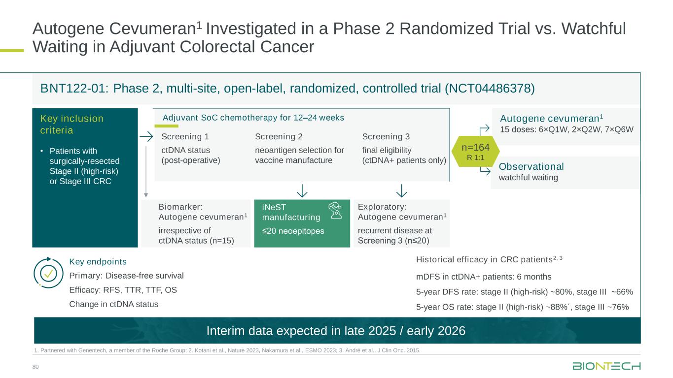 Autogene Cevumeran1 Investigated in a Phase 2 Randomized Trial vs. Watchful Waiting in Adjuvant Colorectal Cancer 80 1. Partnered with Genentech, a member of the Roche Group; 2. Kotani et al., Nature 2023, Nakamura et al., ESMO 2023; 3. André et al., J Clin Onc. 2015. Autogene cevumeran1 15 doses: 6×Q1W, 2×Q2W, 7×Q6W Observational watchful waiting Adjuvant SoC chemotherapy for 12–24 weeksKey inclusion criteria • Patients with surgically-resected Stage II (high-risk) or Stage III CRC Screening 1 ctDNA status (post-operative) Screening 2 neoantigen selection for vaccine manufacture Screening 3 final eligibility (ctDNA+ patients only) n=164 R 1:1 Biomarker: Autogene cevumeran1 irrespective of ctDNA status (n=15) iNeST manufacturing ≤20 neoepitopes Exploratory: Autogene cevumeran1 recurrent disease at Screening 3 (n≤20) Key endpoints Primary: Disease-free survival Efficacy: RFS, TTR, TTF, OS Change in ctDNA status BNT122-01: Phase 2, multi-site, open-label, randomized, controlled trial (NCT04486378) Historical efficacy in CRC patients2, 3 mDFS in ctDNA+ patients: 6 months 5-year DFS rate: stage II (high-risk) ~80%, stage III ~66% 5-year OS rate: stage II (high-risk) ~88%´, stage III ~76% Interim data expected in late 2025 / early 2026