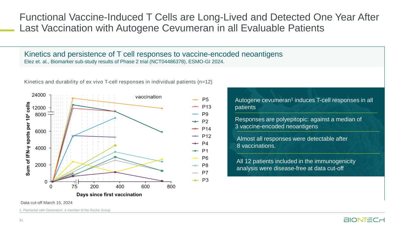 Kinetics and persistence of T cell responses to vaccine-encoded neoantigens Elez et. al., Biomarker sub-study results of Phase 2 trial (NCT04486378), ESMO-GI 2024. Functional Vaccine-Induced T Cells are Long-Lived and Detected One Year After Last Vaccination with Autogene Cevumeran in all Evaluable Patients 81 1. Partnered with Genentech, a member of the Roche Group. Autogene cevumeran1 induces T-cell responses in all patients Responses are polyepitopic: against a median of 3 vaccine-encoded neoantigens Almost all responses were detectable after 8 vaccinations. All 12 patients included in the immunogenicity analysis were disease-free at data cut-off Kinetics and durability of ex vivo T-cell responses in individual patients (n=12) Data cut-off March 15, 2024