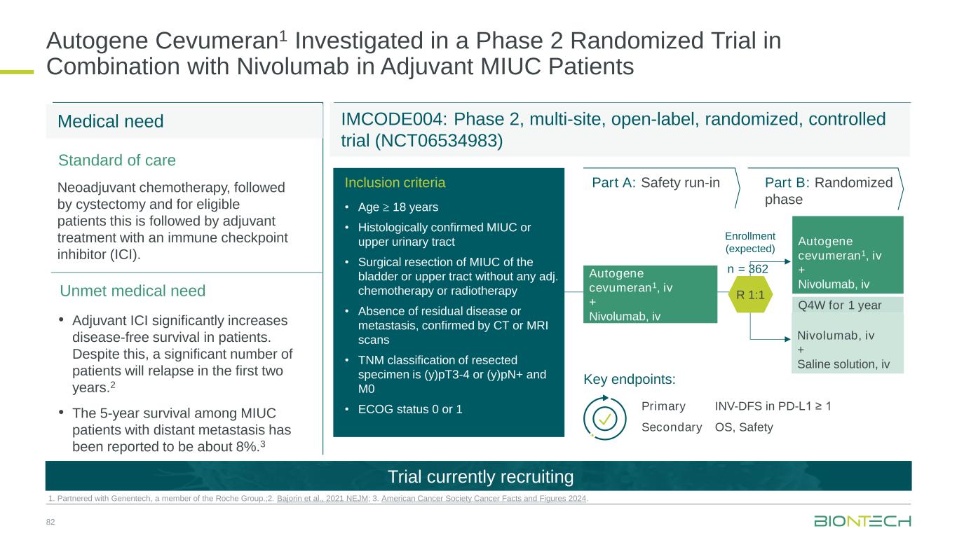 Autogene Cevumeran1 Investigated in a Phase 2 Randomized Trial in Combination with Nivolumab in Adjuvant MIUC Patients 82 1. Partnered with Genentech, a member of the Roche Group.;2. Bajorin et al., 2021 NEJM; 3. American Cancer Society Cancer Facts and Figures 2024. Key endpoints: Inclusion criteria • Age  18 years • Histologically confirmed MIUC or upper urinary tract • Surgical resection of MIUC of the bladder or upper tract without any adj. chemotherapy or radiotherapy • Absence of residual disease or metastasis, confirmed by CT or MRI scans • TNM classification of resected specimen is (y)pT3-4 or (y)pN+ and M0 • ECOG status 0 or 1 Part A: Safety run-in Part B: Randomized phase Nivolumab, iv + Saline solution, iv Autogene cevumeran1, iv + Nivolumab, iv Enrollment (expected) Q4W for 1 year Autogene cevumeran1, iv + Nivolumab, iv n = 362 R 1:1 Neoadjuvant chemotherapy, followed by cystectomy and for eligible patients this is followed by adjuvant treatment with an immune checkpoint inhibitor (ICI). Standard of care • Adjuvant ICI significantly increases disease-free survival in patients. Despite this, a significant number of patients will relapse in the first two years.2 • The 5-year survival among MIUC patients with distant metastasis has been reported to be about 8%.3 Unmet medical need Primary INV-DFS in PD-L1 ≥ 1 Secondary OS, Safety IMCODE004: Phase 2, multi-site, open-label, randomized, controlled trial (NCT06534983) Trial currently recruiting Medical need