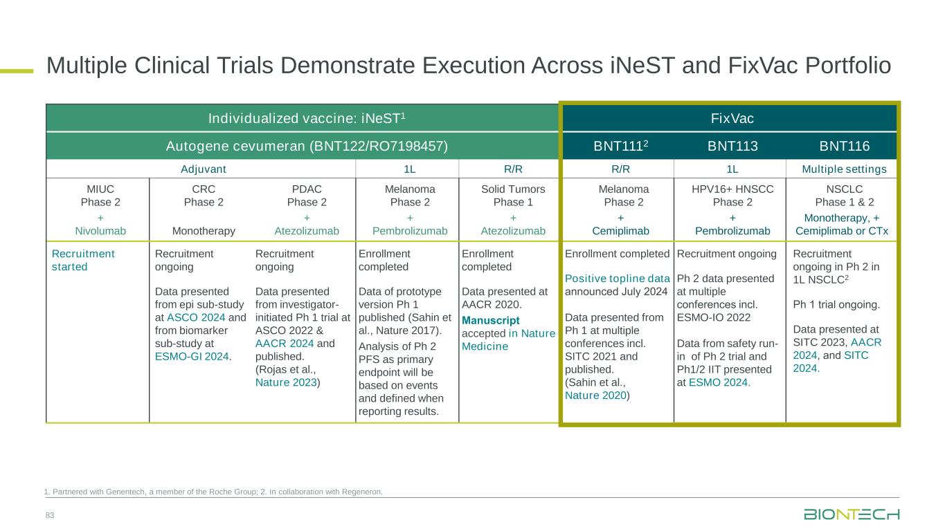 Multiple Clinical Trials Demonstrate Execution Across iNeST and FixVac Portfolio 83 1. Partnered with Genentech, a member of the Roche Group; 2. In collaboration with Regeneron. Individualized vaccine: iNeST1 FixVac Autogene cevumeran (BNT122/RO7198457) BNT1112 BNT113 BNT116 Adjuvant 1L R/R R/R 1L Multiple settings MIUC Phase 2 CRC Phase 2 PDAC Phase 2 Melanoma Phase 2 Solid Tumors Phase 1 Melanoma Phase 2 HPV16+ HNSCC Phase 2 NSCLC Phase 1 & 2 + Nivolumab Monotherapy + Atezolizumab + Pembrolizumab + Atezolizumab + Cemiplimab + Pembrolizumab Monotherapy, + Cemiplimab or CTx Recruitment started Recruitment ongoing Data presented from epi sub-study at ASCO 2024 and from biomarker sub-study at ESMO-GI 2024. Recruitment ongoing Data presented from investigator- initiated Ph 1 trial at ASCO 2022 & AACR 2024 and published. (Rojas et al., Nature 2023) Enrollment completed Data of prototype version Ph 1 published (Sahin et al., Nature 2017). Analysis of Ph 2 PFS as primary endpoint will be based on events and defined when reporting results. Enrollment completed Data presented at AACR 2020. Manuscript ​ accepted in Nature Medicine Enrollment completed Positive topline data announced July 2024​ Data presented from Ph 1 at multiple conferences incl. SITC 2021 and published. (Sahin et al., Nature 2020) Recruitment ongoing Ph 2 data presented at multiple conferences incl.​ ESMO-IO 2022 Data from safety run- in of Ph 2 trial and Ph1/2 IIT presented at ESMO 2024. Recruitment ongoing in Ph 2 in 1L NSCLC2 Ph 1 trial ongoing. ​ Data presented at SITC 2023, AACR 2024​, and SITC 2024.
