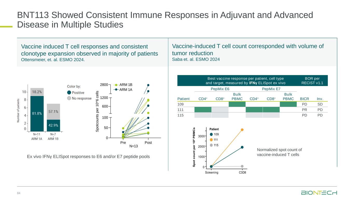 BNT113 Showed Consistent Immune Responses in Adjuvant and Advanced Disease in Multiple Studies 84 Vaccine induced T cell responses and consistent clonotype expansion observed in majority of patients Ottensmeier, et. al. ESMO 2024. Pre Post 0 50 100 600 1200 2800 HARE-40 ELISpot Best response S p o tc o u n ts p e r 1 0 ^ 6 c e lls N=13 1001049 1001046 1001043 1001028 1001022 1001021 1001017 1001016 1001015 1001013 1001009 1001008 1001006 ARM 1A ARM 1B Ex vivo IFNγ ELISpot responses to E6 and/or E7 peptide pools Best vaccine response per patient, cell type and target, measured by IFNγ ELISpot ex vivo BOR per RECIST v1.1 Patient PepMix E6 PepMix E7 BICR Inv.CD4+ CD8+ Bulk PBMC CD4+ CD8+ Bulk PBMC 109 PD SD 111 PR PD 115 PD PD Normalized spot count of vaccine-induced T cells Vaccine-induced T cell count corresponded with volume of tumor reduction Saba et. al. ESMO 2024 0 1000 2000 3000 Screening C3D8 109 111 115
