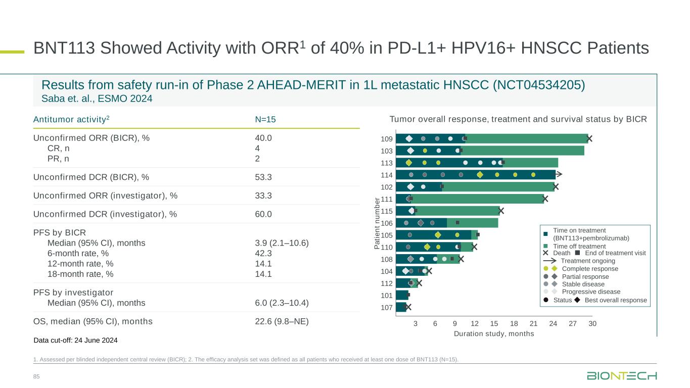 BNT113 Showed Activity with ORR1 of 40% in PD-L1+ HPV16+ HNSCC Patients 85 1. Assessed per blinded independent central review (BICR); 2. The efficacy analysis set was defined as all patients who received at least one dose of BNT113 (N=15). Tumor overall response, treatment and survival status by BICR Antitumor activity2 N=15 Unconfirmed ORR (BICR), % CR, n PR, n 40.0 4 2 Unconfirmed DCR (BICR), % 53.3 Unconfirmed ORR (investigator), % 33.3 Unconfirmed DCR (investigator), % 60.0 PFS by BICR Median (95% CI), months 6-month rate, % 12-month rate, % 18-month rate, % 3.9 (2.1–10.6) 42.3 14.1 14.1 PFS by investigator Median (95% CI), months 6.0 (2.3–10.4) OS, median (95% CI), months 22.6 (9.8–NE) Results from safety run-in of Phase 2 AHEAD-MERIT in 1L metastatic HNSCC (NCT04534205) Saba et. al., ESMO 2024 3 6 9 30272421181512 Duration study, months 114 113 105 109 103 110 106 102 108 104 115 111 112 101 107 P a ti e n t n u m b e r Time on treatment (BNT113+pembrolizumab) Complete response End of treatment visit Treatment ongoing Time off treatment Status Best overall response Partial response Stable disease Progressive disease Death Data cut-off: 24 June 2024