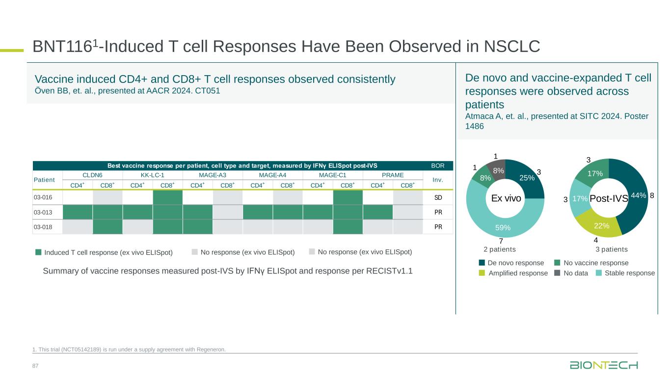 De novo and vaccine-expanded T cell responses were observed across patients Atmaca A, et. al., presented at SITC 2024. Poster 1486 BNT1161-Induced T cell Responses Have Been Observed in NSCLC 87 Vaccine induced CD4+ and CD8+ T cell responses observed consistently Öven BB, et. al., presented at AACR 2024. CT051 Induced T cell response (ex vivo ELISpot) No response (ex vivo ELISpot) BOR CD4+ CD8+ CD4+ CD8+ CD4+ CD8+ CD4+ CD8+ CD4+ CD8+ CD4+ CD8+ 03-016 SD 03-013 PR 03-018 PR Inv. Best vaccine response per patient, cell type and target, measured by IFNγ ELISpot post-IVS Patient CLDN6 KK-LC-1 MAGE-A3 MAGE-A4 MAGE-C1 PRAME De novo response Amplified response No vaccine response No data 2 patients 3 patients De novo response Stable response No vaccine response No data Ex vivo 8% 8% 25% 59% 1 1 3 7 De novo response Stable response No vaccine response Post-IVS17% 17% 44% 22% 3 3 8 4 Amplified response Stable response No response (ex vivo ELISpot) Summary of vaccine responses measured post-IVS by IFNγ ELISpot and response per RECISTv1.1 1. This trial (NCT05142189) is run under a supply agreement with Regeneron.