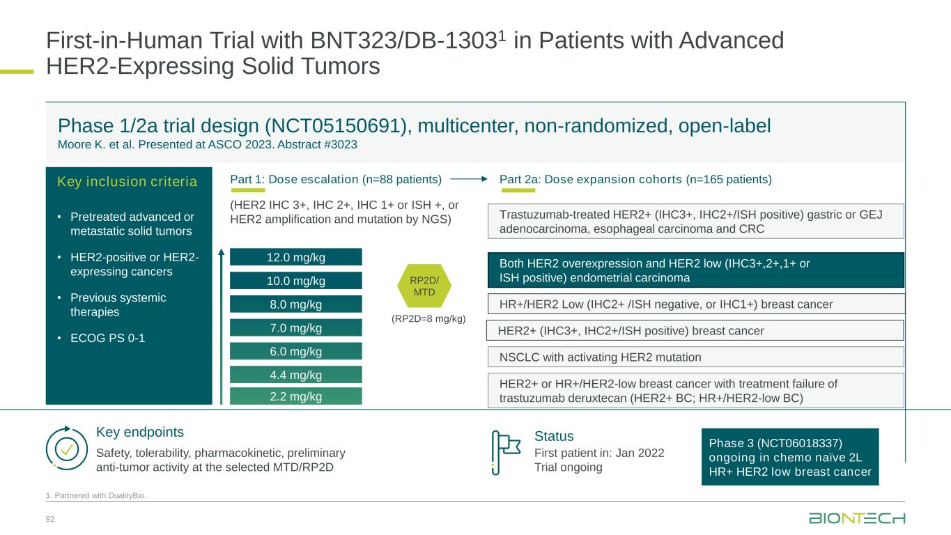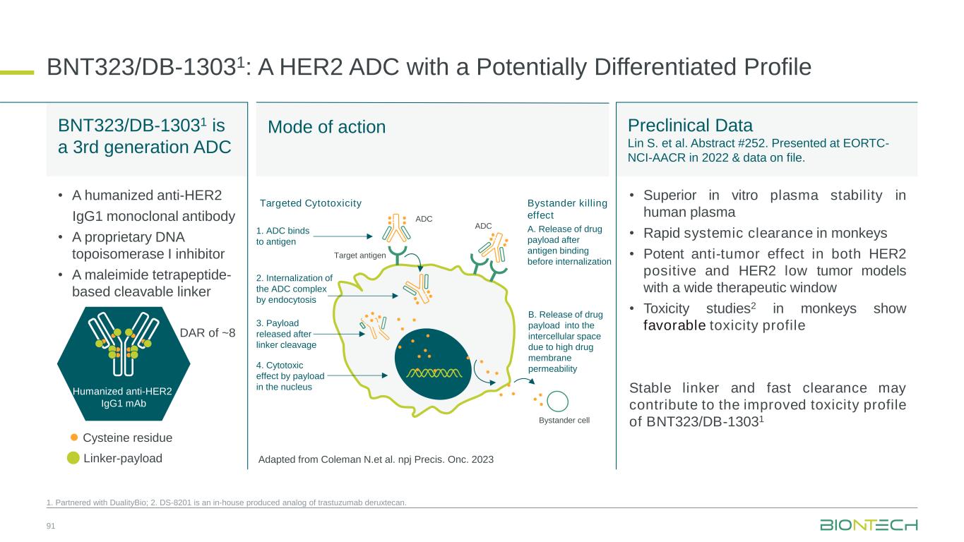 BNT323/DB-13031: A HER2 ADC with a Potentially Differentiated Profile 91 1. Partnered with DualityBio; 2. DS-8201 is an in-house produced analog of trastuzumab deruxtecan. Preclinical Data Lin S. et al. Abstract #252. Presented at EORTC- NCI-AACR in 2022 & data on file. BNT323/DB-13031 is a 3rd generation ADC Mode of action • Superior in vitro plasma stability in human plasma • Rapid systemic clearance in monkeys • Potent anti-tumor effect in both HER2 positive and HER2 low tumor models with a wide therapeutic window • Toxicity studies2 in monkeys show favorable toxicity profile Stable linker and fast clearance may contribute to the improved toxicity profile of BNT323/DB-13031 Humanized anti-HER2 IgG1 mAb DAR of ~8 Cysteine residue Linker-payload • A humanized anti-HER2 IgG1 monoclonal antibody • A proprietary DNA topoisomerase I inhibitor • A maleimide tetrapeptide- based cleavable linker 1. ADC binds to antigen 2. Internalization of the ADC complex by endocytosis 3. Payload released after linker cleavage Target antigen ADC 4. Cytotoxic effect by payload in the nucleus Bystander cell Targeted Cytotoxicity Bystander killing effect A. Release of drug payload after antigen binding before internalization B. Release of drug payload into the intercellular space due to high drug membrane permeability ADC Adapted from Coleman N.et al. npj Precis. Onc. 2023
