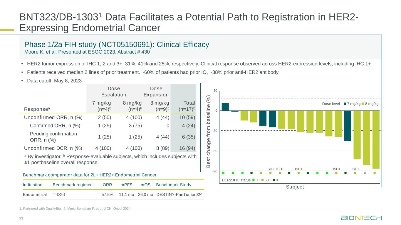 First-in-Human Trial with BNT323/DB-13031 in Patients with Advanced HER2-Expressing Solid Tumors 1. Partnered with DualityBio. 92 Phase 1/2a trial design (NCT05150691), multicenter, non-randomized, open-label Moore K. et al. Presented at ASCO 2023. Abstract #3023 Part 1: Dose escalation (n=88 patients) Part 2a: Dose expansion cohorts (n=165 patients) (HER2 IHC 3+, IHC 2+, IHC 1+ or ISH +, or HER2 amplification and mutation by NGS) Status First patient in: Jan 2022 Trial ongoing Trastuzumab-treated HER2+ (IHC3+, IHC2+/ISH positive) gastric or GEJ adenocarcinoma, esophageal carcinoma and CRC 10.0 mg/kg 12.0 mg/kg 8.0 mg/kg 7.0 mg/kg 6.0 mg/kg 4.4 mg/kg 2.2 mg/kg Both HER2 overexpression and HER2 low (IHC3+,2+,1+ or ISH positive) endometrial carcinoma HR+/HER2 Low (IHC2+ /ISH negative, or IHC1+) breast cancer HER2+ (IHC3+, IHC2+/ISH positive) breast cancer NSCLC with activating HER2 mutation HER2+ or HR+/HER2-low breast cancer with treatment failure of trastuzumab deruxtecan (HER2+ BC; HR+/HER2-low BC) Key endpoints Safety, tolerability, pharmacokinetic, preliminary anti-tumor activity at the selected MTD/RP2D Key inclusion criteria • Pretreated advanced or metastatic solid tumors • HER2-positive or HER2- expressing cancers • Previous systemic therapies • ECOG PS 0-1 (RP2D=8 mg/kg) RP2D/ MTD Phase 3 (NCT06018337) ongoing in chemo naïve 2L HR+ HER2 low breast cancer
