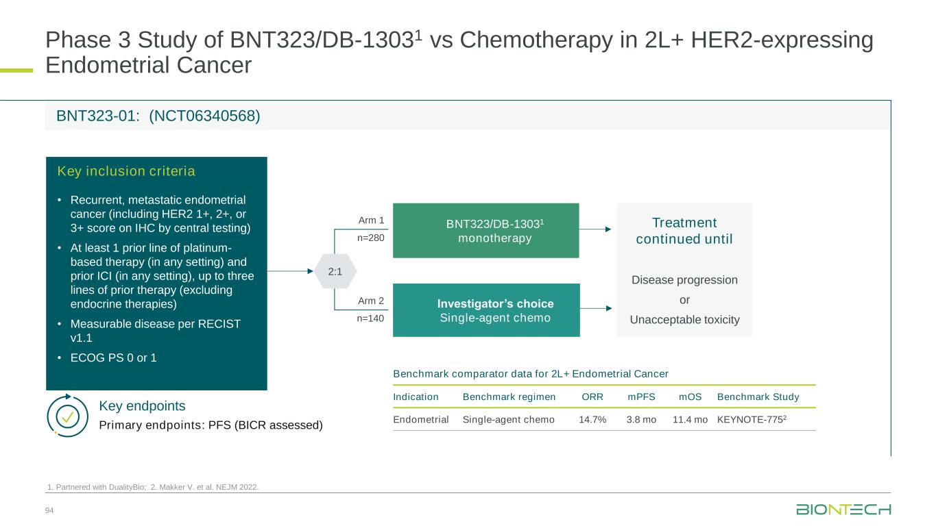 BNT323/DB-13031 Data Facilitates a Potential Path to Registration in HER2- Expressing Endometrial Cancer 93 1. Partnered with DualityBio; 2. Meric-Bernstam F. et al. J Clin Oncol 2024. Phase 1/2a FIH study (NCT05150691): Clinical Efficacy Moore K. et al. Presented at ESGO 2023. Abstract # 430 Responsea Dose Escalation Dose Expansion Total (n=17)b 7 mg/kg (n=4)b 8 mg/kg (n=4)b 8 mg/kg (n=9)b Unconfirmed ORR, n (%) 2 (50) 4 (100) 4 (44) 10 (59) Confirmed ORR, n (%) 1 (25) 3 (75) 0 4 (24) Pending confirmation ORR, n (%) 1 (25) 1 (25) 4 (44) 6 (35) Unconfirmed DCR, n (%) 4 (100) 4 (100) 8 (89) 16 (94) a By investigator. b Response-evaluable subjects, which includes subjects with ≥1 postbaseline overall response. B e s t c h a n g e f ro m b a s e li n e ( % ) ISH+ ISH+ ISH+ ISH+ ISH+ # Subject 30 0 -30 -60 -90 Dose level 7 mg/kg 8 mg/kg 1+ 2+ 3+HER2 IHC status • HER2 tumor expression of IHC 1, 2 and 3+: 31%, 41% and 25%, respectively. Clinical response observed across HER2-expression levels, including IHC 1+ • Patients received median 2 lines of prior treatment. ~60% of patients had prior IO, ~38% prior anti-HER2 antibody • Data cutoff: May 8, 2023 Benchmark comparator data for 2L+ HER2+ Endometrial Cancer Indication Benchmark regimen ORR mPFS mOS Benchmark Study Endometrial T-DXd 57.5% 11.1 mo 26.0 mo DESTINY-PanTumor022