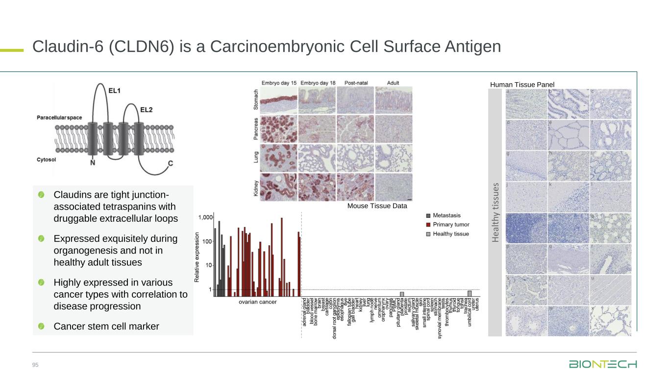 Claudin-6 (CLDN6) is a Carcinoembryonic Cell Surface Antigen 95 Claudins are tight junction- associated tetraspanins with druggable extracellular loops Expressed exquisitely during organogenesis and not in healthy adult tissues Highly expressed in various cancer types with correlation to disease progression Cancer stem cell marker a b c d e f g h i j k l m n o p q r s t u v w x H ea lt h y ti ss u es Mouse Tissue Data Human Tissue Panel