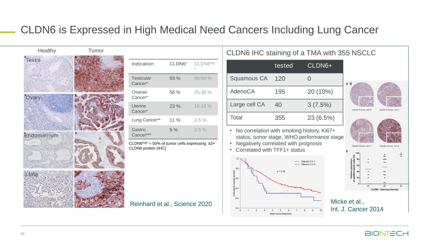 CLDN6 is Expressed in High Medical Need Cancers Including Lung Cancer 96 Ovary Endometrium Lung Testis Healthy Tumor Indication CLDN6+ CLDN6hig h Testicular Cancer* 93 % 90-93 % Ovarian Cancer* 56 % 25-30 % Uterine Cancer* 23 % 10-15 % Lung Cancer** 11 % 2-5 % Gastric Cancer*** 9 % 2-5 % CLDN6high = 50% of tumor cells expressing ≥2+ CLDN6 protein (IHC) Micke et al., Int. J. Cancer 2014 CLDN6 IHC staining of a TMA with 355 NSCLC tested CLDN6+ Squamous CA 120 0 AdenoCA 195 20 (10%) Large cell CA 40 3 (7.5%) Total 355 23 (6.5%) • No correlation with smoking history, Ki67+ status, tumor stage, WHO performance stage • Negatively correlated with prognosis • Correlated with TFF1+ status Reinhard et al., Science 2020