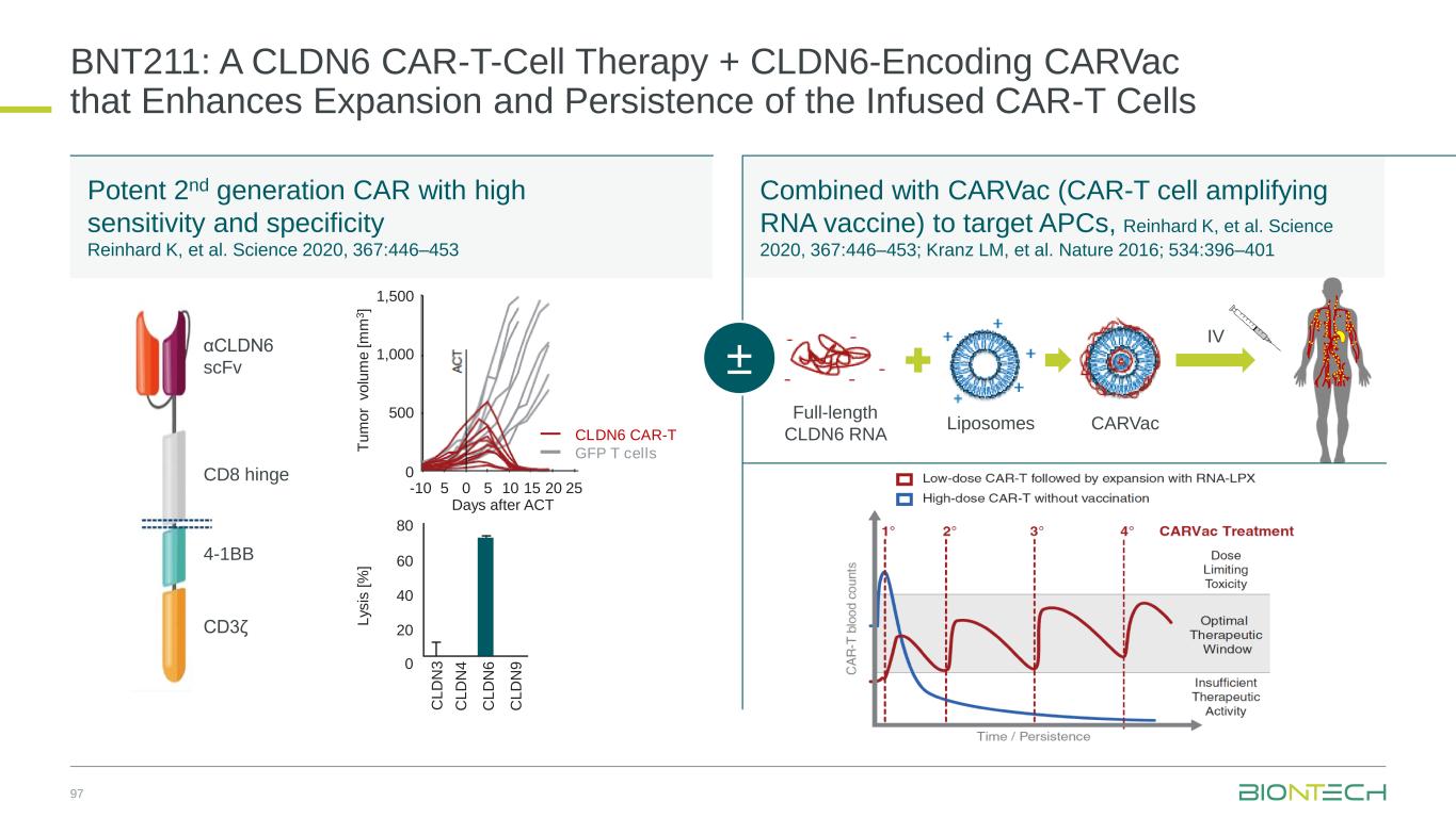 Potent 2nd generation CAR with high sensitivity and specificity Reinhard K, et al. Science 2020, 367:446–453 BNT211: A CLDN6 CAR-T-Cell Therapy + CLDN6-Encoding CARVac that Enhances Expansion and Persistence of the Infused CAR-T Cells αCLDN6 scFv CD8 hinge 4-1BB CD3ζ L ys is [ % ] C L D N 3 C L D N 4 C L D N 6 C L D N 9 80 60 40 20 0 Liposomes Full-length CLDN6 RNA CARVac IV Combined with CARVac (CAR-T cell amplifying RNA vaccine) to target APCs, Reinhard K, et al. Science 2020, 367:446–453; Kranz LM, et al. Nature 2016; 534:396–401 CLDN6 CAR-T GFP T cells 0 500 1,000 1,500 -10 5 0 5 10 15 20 25 T u m o r v o lu m e [ m m 3 ] Days after ACT ± 97