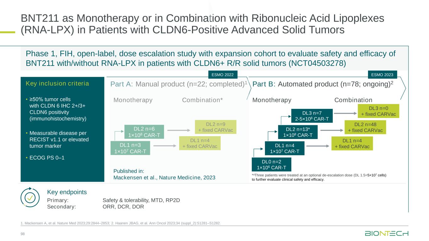 Key inclusion criteria • ≥50% tumor cells with CLDN 6 IHC 2+/3+ CLDN6 positivity (immunohistochemistry) • Measurable disease per RECIST v1.1 or elevated tumor marker • ECOG PS 0–1 BNT211 as Monotherapy or in Combination with Ribonucleic Acid Lipoplexes (RNA-LPX) in Patients with CLDN6-Positive Advanced Solid Tumors 98 1. Mackensen A, et al. Nature Med 2023;29:2844–2853; 2. Haanen JBAG, et al. Ann Oncol 2023;34 (suppl_2):S1281–S1282. Part B: Automated product (n=78; ongoing)2 Key endpoints Primary: Safety & tolerability, MTD, RP2D Secondary: ORR, DCR, DOR Phase 1, FIH, open-label, dose escalation study with expansion cohort to evaluate safety and efficacy of BNT211 with/without RNA-LPX in patients with CLDN6+ R/R solid tumors (NCT04503278) Part A: Manual product (n=22; completed)1 DL2 n=9 + fixed CARVac DL1 n=4 + fixed CARVac DL2 n=6 1×108 CAR-T DL1 n=3 1×107 CAR-T Monotherapy Combination* DL2 n=13* 1×108 CAR-T DL1 n=4 1×107 CAR-T Monotherapy Combination DL3 n=7 2-5×108 CAR-T DL0 n=2 1×106 CAR-T DL2 n=48 + fixed CARVac DL1 n=4 + fixed CARVac DL3 n=0 + fixed CARVac ESMO 2023 *aThree patients were treated at an optional de-escalation dose (DL 1.5=5×107 cells) to further evaluate clinical safety and efficacy. Published in: Mackensen et al., Nature Medicine, 2023 ESMO 2022