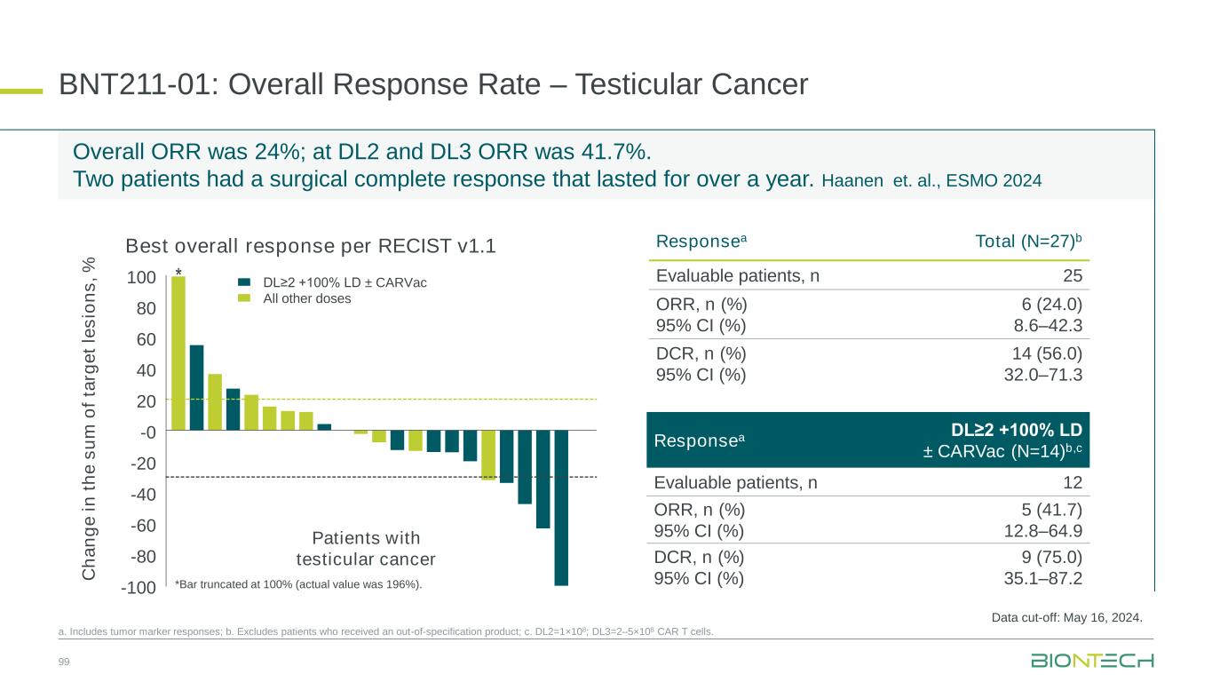 BNT211-01: Overall Response Rate – Testicular Cancer a. Includes tumor marker responses; b. Excludes patients who received an out-of-specification product; c. DL2=1×108; DL3=2–5×108 CAR T cells. Overall ORR was 24%; at DL2 and DL3 ORR was 41.7%. Two patients had a surgical complete response that lasted for over a year. Haanen et. al., ESMO 2024 Responsea Total (N=27)b Evaluable patients, n 25 ORR, n (%) 95% CI (%) 6 (24.0) 8.6–42.3 DCR, n (%) 95% CI (%) 14 (56.0) 32.0–71.3 Responsea DL≥2 +100% LD ± CARVac (N=14)b,c Evaluable patients, n 12 ORR, n (%) 95% CI (%) 5 (41.7) 12.8–64.9 DCR, n (%) 95% CI (%) 9 (75.0) 35.1–87.2C h a n g e i n t h e s u m o f ta rg e t le s io n s , % 100 80 40 20 -0 -20 -40 -60 -80 -100 60 Best overall response per RECIST v1.1 Patients with testicular cancer DL≥2 +100% LD ± CARVac All other doses * *Bar truncated at 100% (actual value was 196%). Data cut-off: May 16, 2024. 99