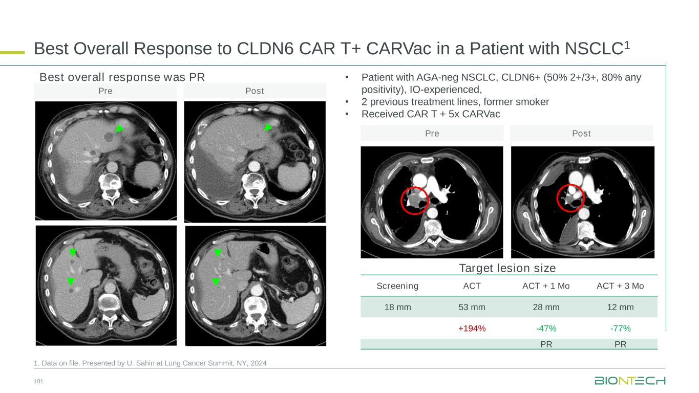Best Overall Response to CLDN6 CAR T+ CARVac in a Patient with NSCLC1 1. Data on file. Presented by U. Sahin at Lung Cancer Summit, NY, 2024 Best overall response was PR Pre Post Pre Post Screening ACT ACT + 1 Mo ACT + 3 Mo 18 mm 53 mm 28 mm 12 mm +194% -47% -77% PR PR Target lesion size • Patient with AGA-neg NSCLC, CLDN6+ (50% 2+/3+, 80% any positivity), IO-experienced, • 2 previous treatment lines, former smoker • Received CAR T + 5x CARVac 101