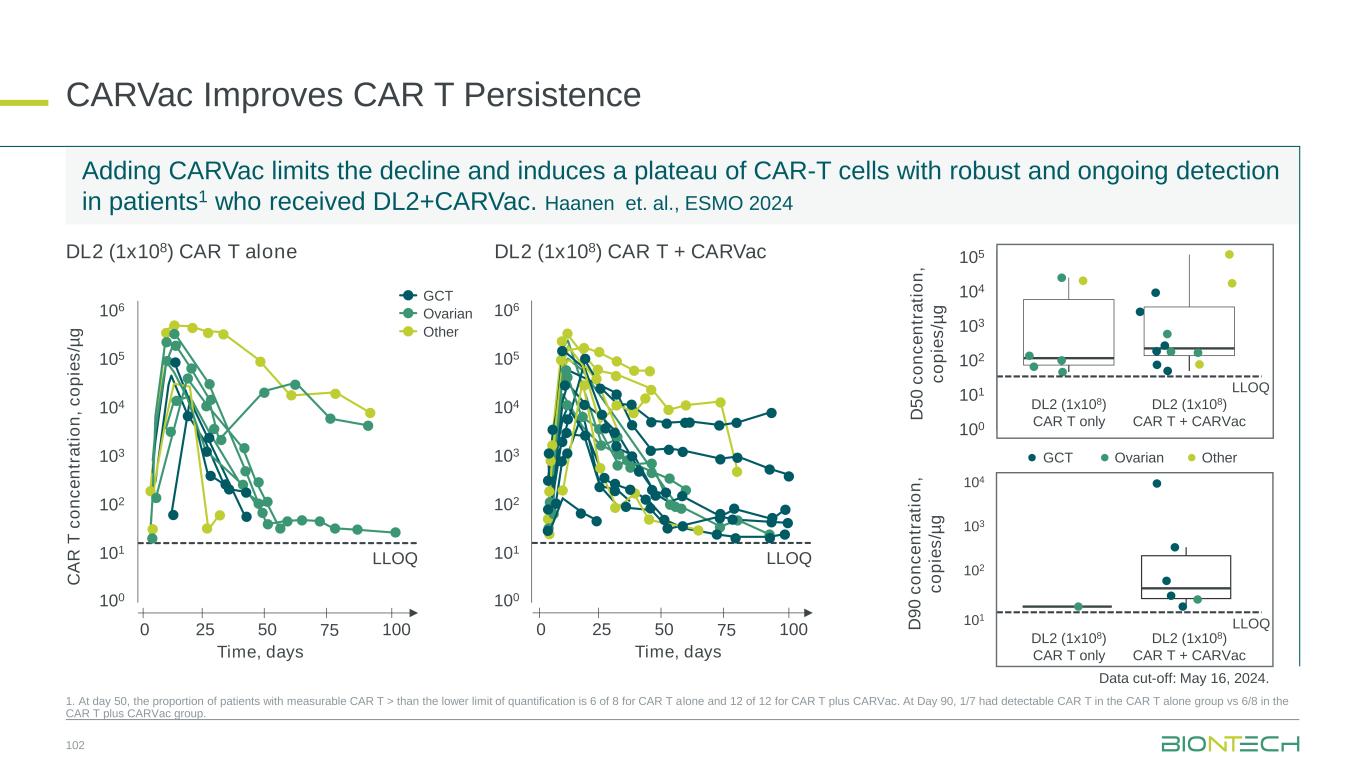CARVac Improves CAR T Persistence 102 1. At day 50, the proportion of patients with measurable CAR T > than the lower limit of quantification is 6 of 8 for CAR T alone and 12 of 12 for CAR T plus CARVac. At Day 90, 1/7 had detectable CAR T in the CAR T alone group vs 6/8 in the CAR T plus CARVac group. Adding CARVac limits the decline and induces a plateau of CAR-T cells with robust and ongoing detection in patients1 who received DL2+CARVac. Haanen et. al., ESMO 2024 D 5 0 c o n c e n tr a ti o n , c o p ie s /µ g DL2 (1x108) CAR T + CARVac 105 104 103 102 101 100 DL2 (1x108) CAR T only LLOQ D 9 0 c o n c e n tr a ti o n , c o p ie s /µ g DL2 (1x108) CAR T + CARVac 104 103 102 101 DL2 (1x108) CAR T only LLOQ GCT Ovarian Other Data cut-off: May 16, 2024. DL2 (1x108) CAR T alone C A R T c o n c e n tr a ti o n , c o p ie s /µ g 106 105 104 103 102 101 100 Time, days 0 5025 10075 LLOQ GCT Ovarian Other DL2 (1x108) CAR T + CARVac Time, days 0 5025 10075 106 105 104 103 102 101 100 LLOQ