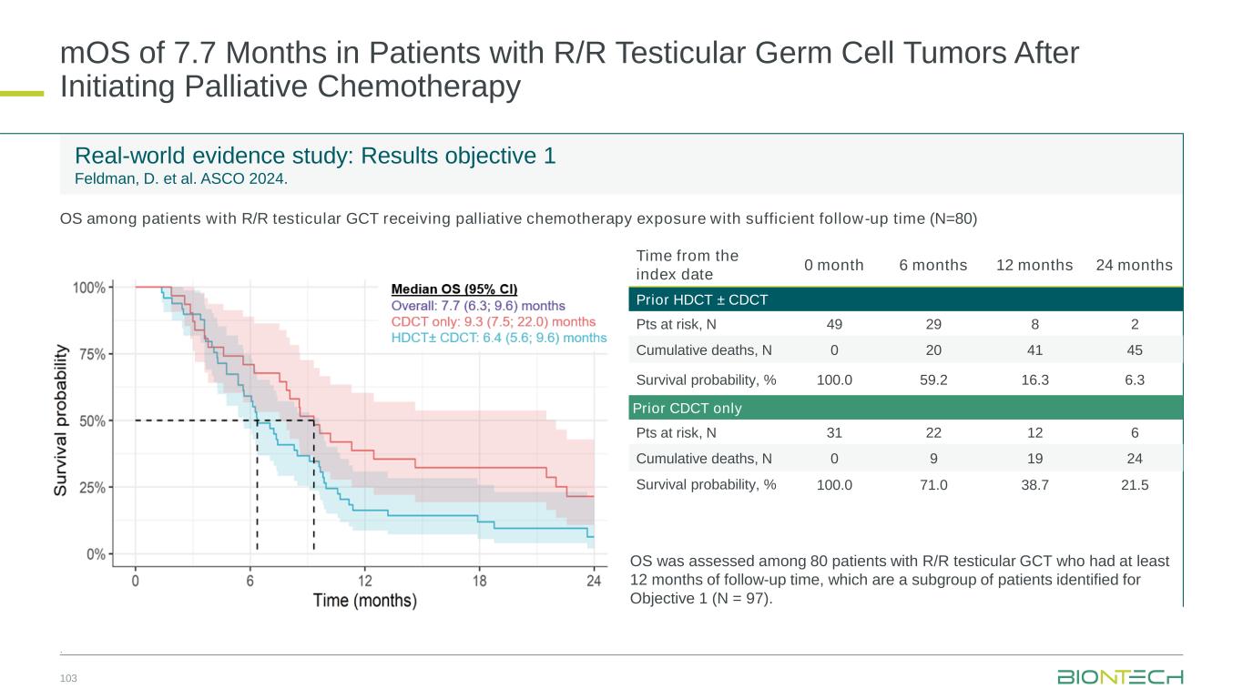 mOS of 7.7 Months in Patients with R/R Testicular Germ Cell Tumors After Initiating Palliative Chemotherapy 103 . Real-world evidence study: Results objective 1 Feldman, D. et al. ASCO 2024. OS among patients with R/R testicular GCT receiving palliative chemotherapy exposure with sufficient follow-up time (N=80) Time from the index date 0 month 6 months 12 months 24 months Prior HDCT ± CDCT Pts at risk, N 49 29 8 2 Cumulative deaths, N 0 20 41 45 Survival probability, % 100.0 59.2 16.3 6.3 Prior CDCT only Pts at risk, N 31 22 12 6 Cumulative deaths, N 0 9 19 24 Survival probability, % 100.0 71.0 38.7 21.5 OS was assessed among 80 patients with R/R testicular GCT who had at least 12 months of follow-up time, which are a subgroup of patients identified for Objective 1 (N = 97).