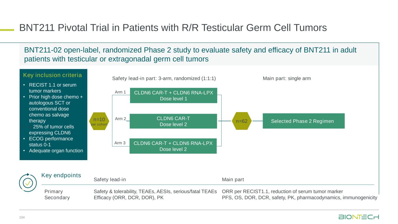 Safety lead-in Main part Primary Safety & tolerability, TEAEs, AESIs, serious/fatal TEAEs ORR per RECIST1.1, reduction of serum tumor marker Secondary Efficacy (ORR, DCR, DOR), PK PFS, OS, DOR, DCR, safety, PK, pharmacodynamics, immunogenicity BNT211 Pivotal Trial in Patients with R/R Testicular Germ Cell Tumors 104 Key inclusion criteria • RECIST 1.1 or serum tumor markers • Prior high dose chemo + autologous SCT or conventional dose chemo as salvage therapy • ≥ 25% of tumor cells expressing CLDN6 • ECOG performance status 0-1 • Adequate organ function BNT211-02 open-label, randomized Phase 2 study to evaluate safety and efficacy of BNT211 in adult patients with testicular or extragonadal germ cell tumors Key endpoints Safety lead-in part: 3-arm, randomized (1:1:1) Main part: single arm CLDN6 CAR-T Dose level 2 Arm 1 Arm 2 Arm 3 Selected Phase 2 Regimen CLDN6 CAR-T + CLDN6 RNA-LPX Dose level 1 CLDN6 CAR-T + CLDN6 RNA-LPX Dose level 2 n=62n=10 per cohort