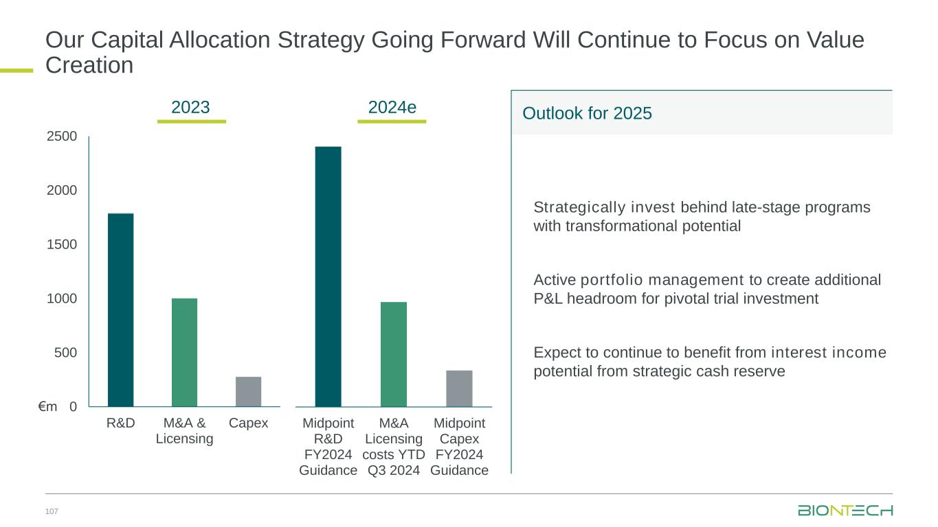 Progress in the Last Twelve Months Demonstrates the Strength of our Model and our Strategy 106 1. Consists of cash and cash equivalents of €9,624.6 million, current security investments of €7,078 million and non-current security investments of €1,137.2 million, as of September 30, 2024, and does not include announced Biotheus acquisition considerations. 2023 2024 COVID-19 Maintained leading market share (>50%) Oncology Portfolio 7 Phase 2/3 trial starts >67% year-on-year increase in average quarterly patient enrollment in trials Infectious Disease Vaccine Portfolio Three Phase 1 trial starts Corporate Development Acquisitions of InstaDeep and Biotheus announced Six in-licensed molecules Cash Balance Grew cash balance from Q3 2023 to Q3 2024 (€17.0B to €17.8B1)